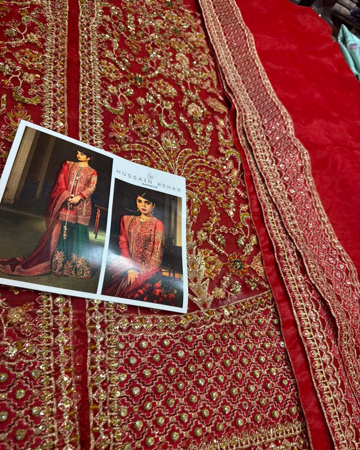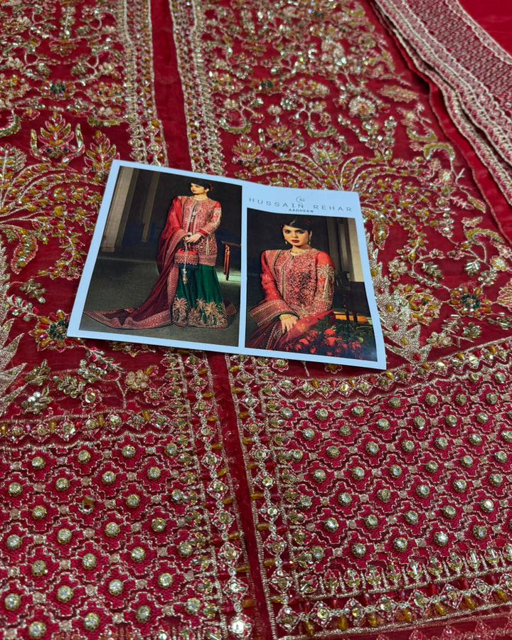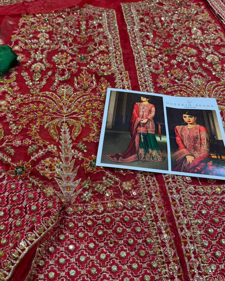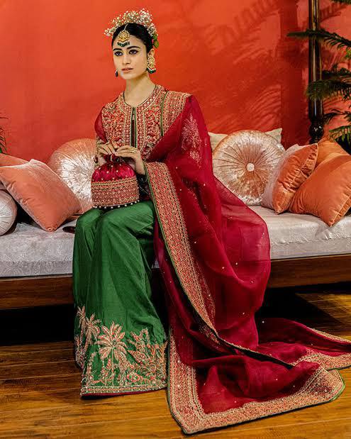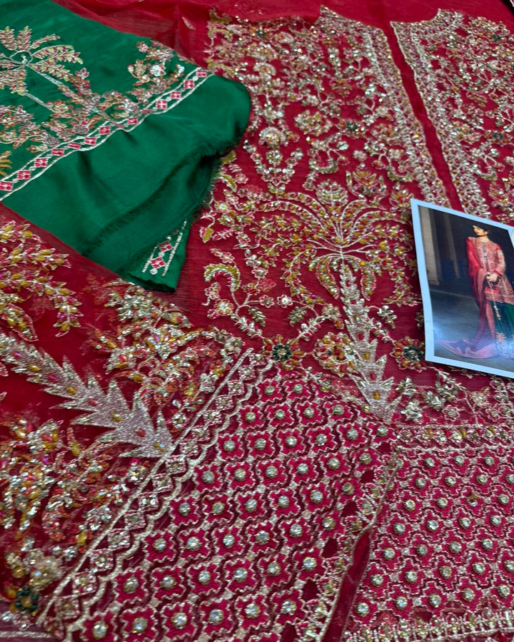 This hot pink front open jacket adorns overall embroidery in shades of green, pinks and mustard topped with hand embellishment along with green accents. Paired with contrasting green heavily embellished palazzo pants, and hot pink organza dupatta with sequin, pearl spray and chunky borders.