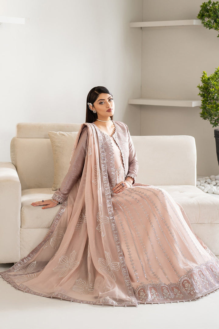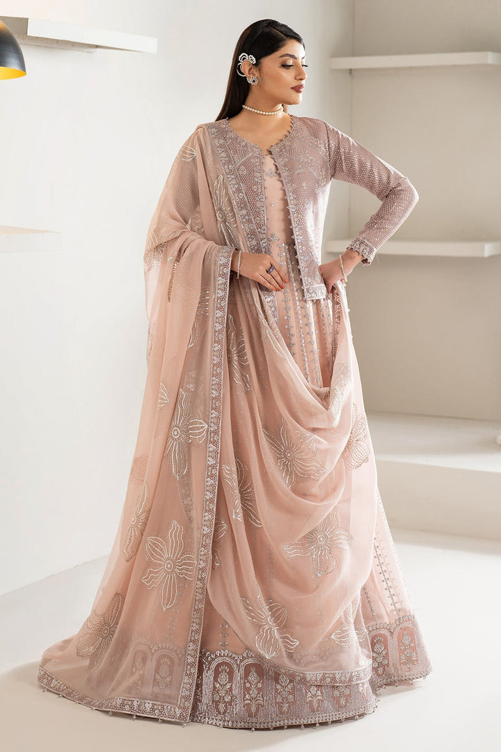 This striking ensemble features a soft pink chiffon maxi?dorned with intricate silver embroidery details with delicate sequins that add a subtle shimmer. paired with a beautifully embroidered silk jacket and printed raw silk trousers, the look is completed with a chiffon dupatta featuring contrasting embroidered borders , making this piece perfect for memorable occasions.