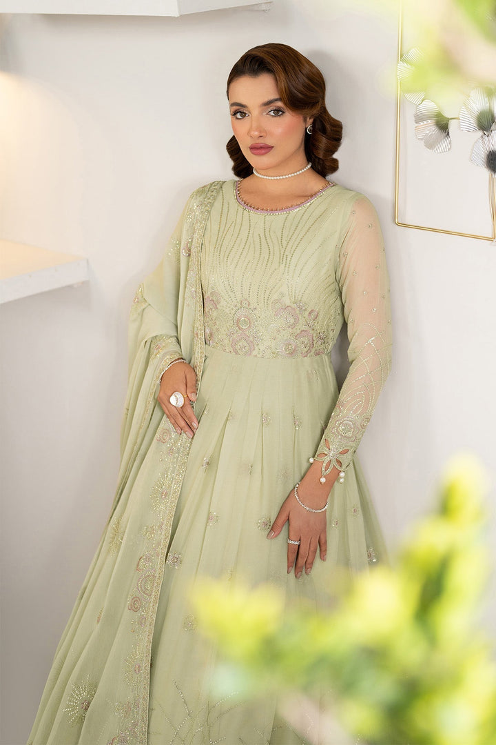"Zenel" is an enchanting mint green ensemble featuring a maxi with a fitted bodice, showcasing embroidery, bringing delicate artistry to every detail. This exquisite piece is uplifted with tonal threadwork and sequins, complemented by raw silk trousers and a soft chiffon dupatta adorned with intricate embroidery.