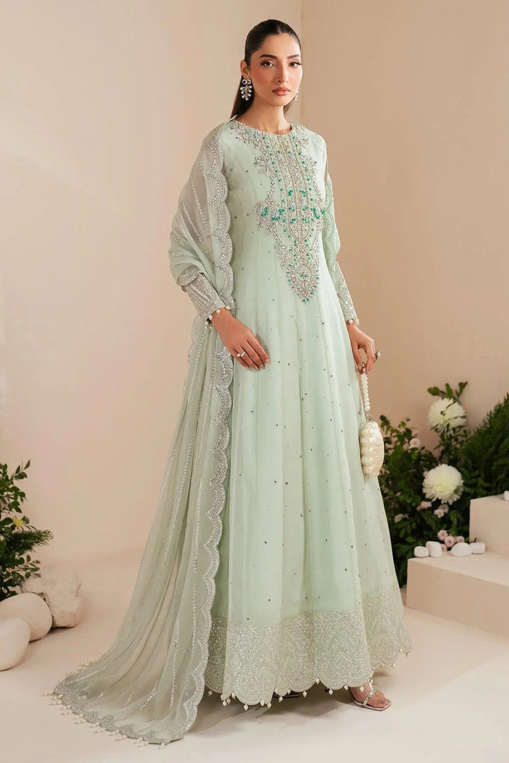"Rimel" is a breathtaking mint green muskaish chiffon ensemble, featuring a beautifully embroidered neckline with contrasting threads, accentuated by delicate hand embellishments. The look is completed with a stunning chiffon dupatta, adorned with a detailed four-sided embroidered border, and paired with raw silk trousers, creating a striking focal point. Perfectly designed for the festive season, this piece is truly a masterpiece.