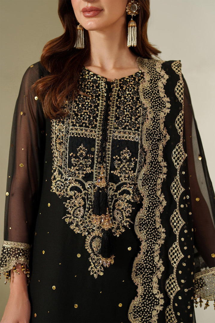 Classic black ensemble celebrates handmade craftsmanship with a front adorned in Mukesh work and ?old thread embroidery. The neckline features a richly embroidered organza patch, showcasing ?eometric patterns with gold zari, sequins, and beadwork. The ?leeves are embellished with scattered Mukesh detailing and finished with scalloped cuffs, tassels, and beadwork. Paired with trousers finished with an elegant embroidered border, this ensemble offers a refined silhouette, blending regal tradition with modern elegance