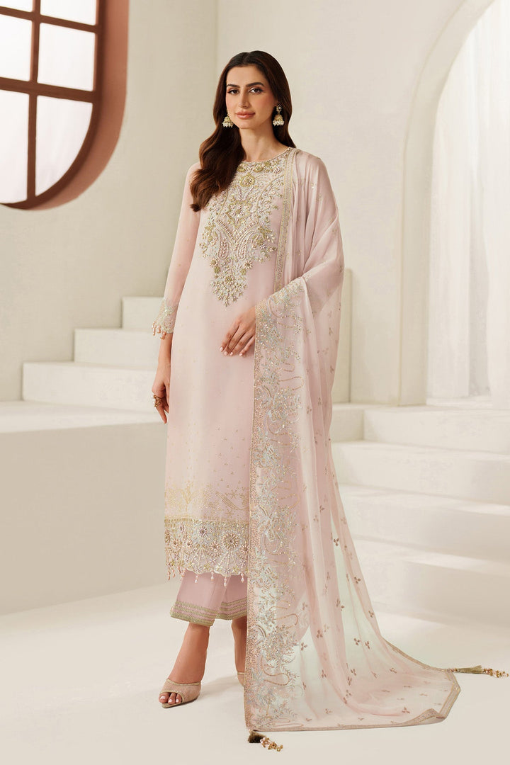 Drape yourself in understated luxury with this blush pink outfit, adorned with a stone-studded front and sleeves that add just the right touch of shimmer. The meticulously embroidered front reflects expert craftsmanship and timeless design. Styled with a matching embellished dupatta and complementing trousers, perfect for those who prefer elegance over extravagance
