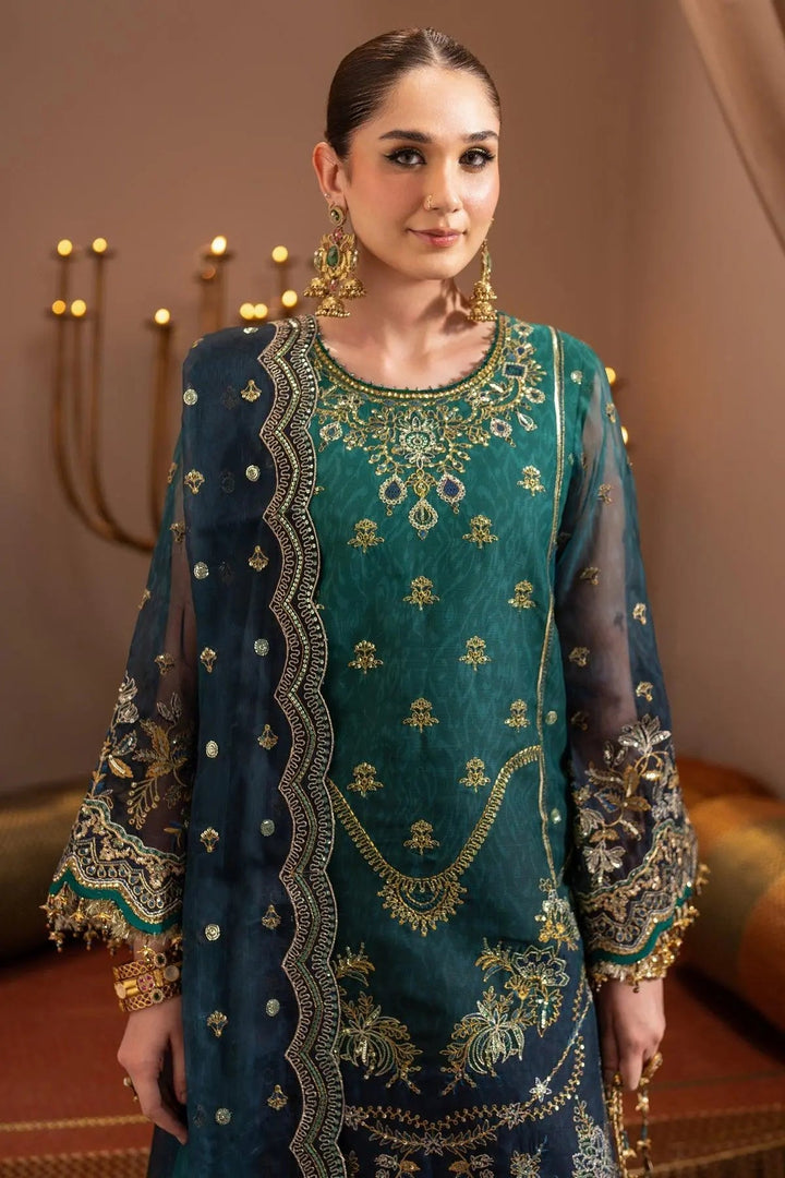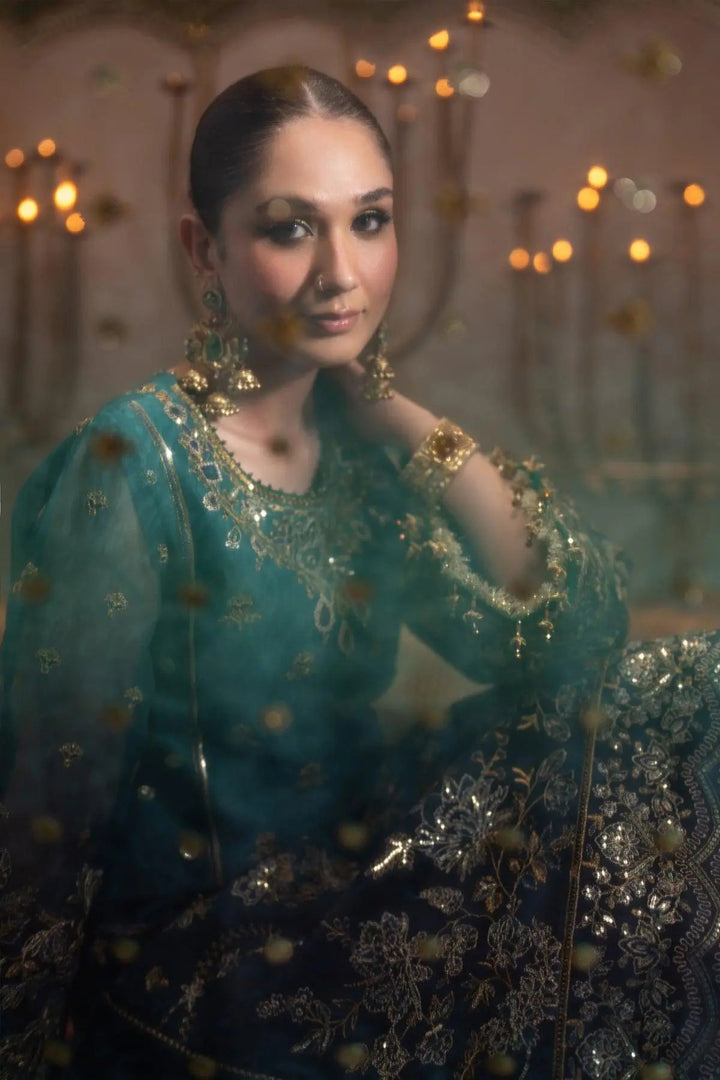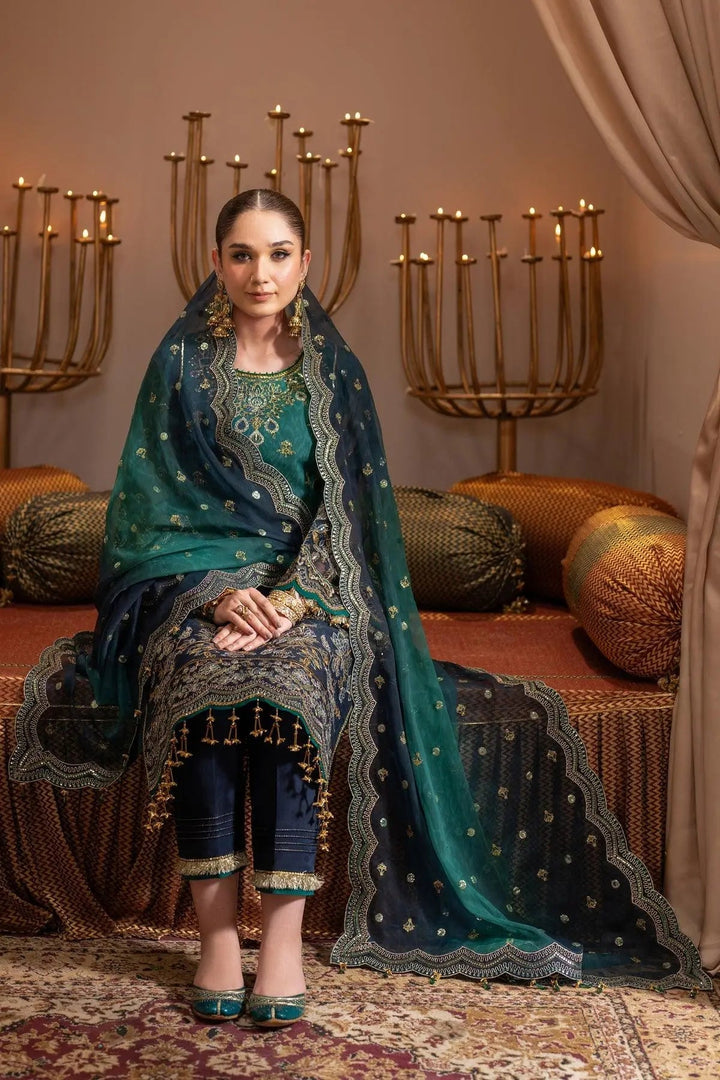 Dewaani?s a stunning ensemble that combines zinc and dark green on a breathable chiffon base. It features beautiful embroidery on the neckline, along with intricate motifs on the borders and sleeves. The outfit is completed with a shaded chiffon dupatta adorned with embroidery and paired with raw silk trousers.