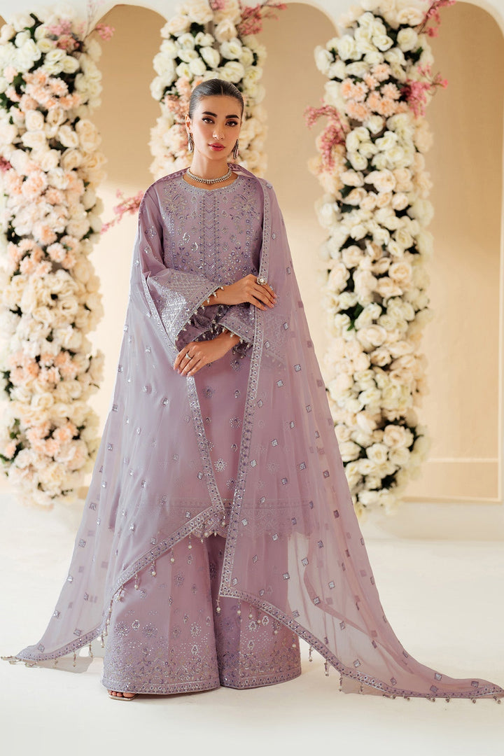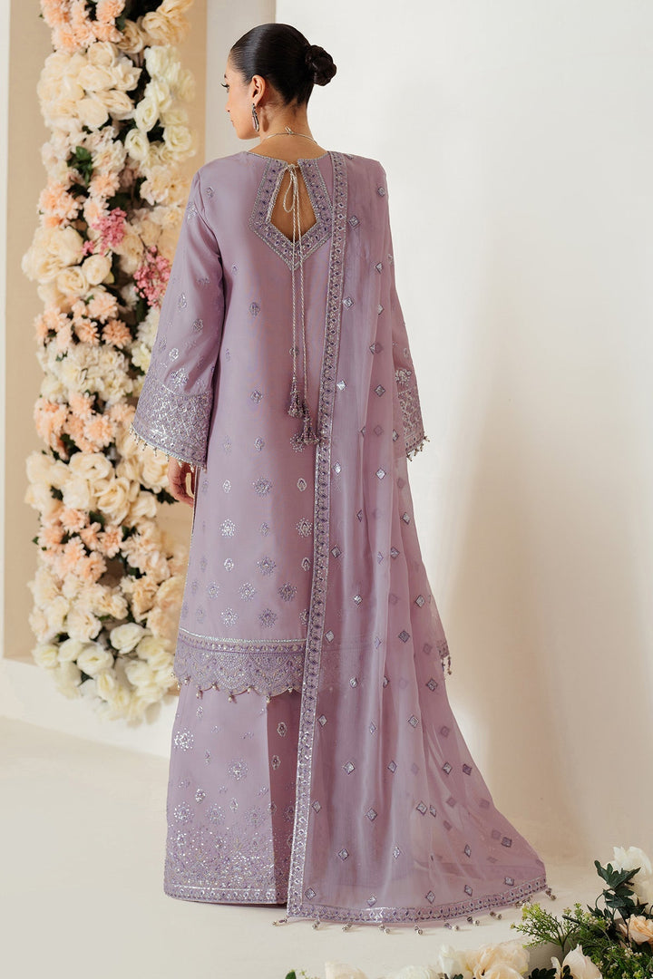 Berry is an exquisite raw silk pastel ensemble adorned with intricate silver embroidery and shimmering details adding a fresh, contemporary twist, while the embroidered chiffon dupatta and raw silk tonal trousers, adorned with delicate floral motifs, perfectly complete the look.