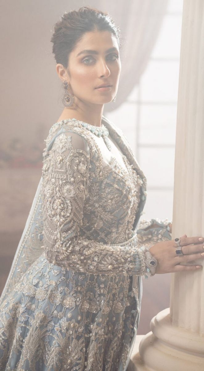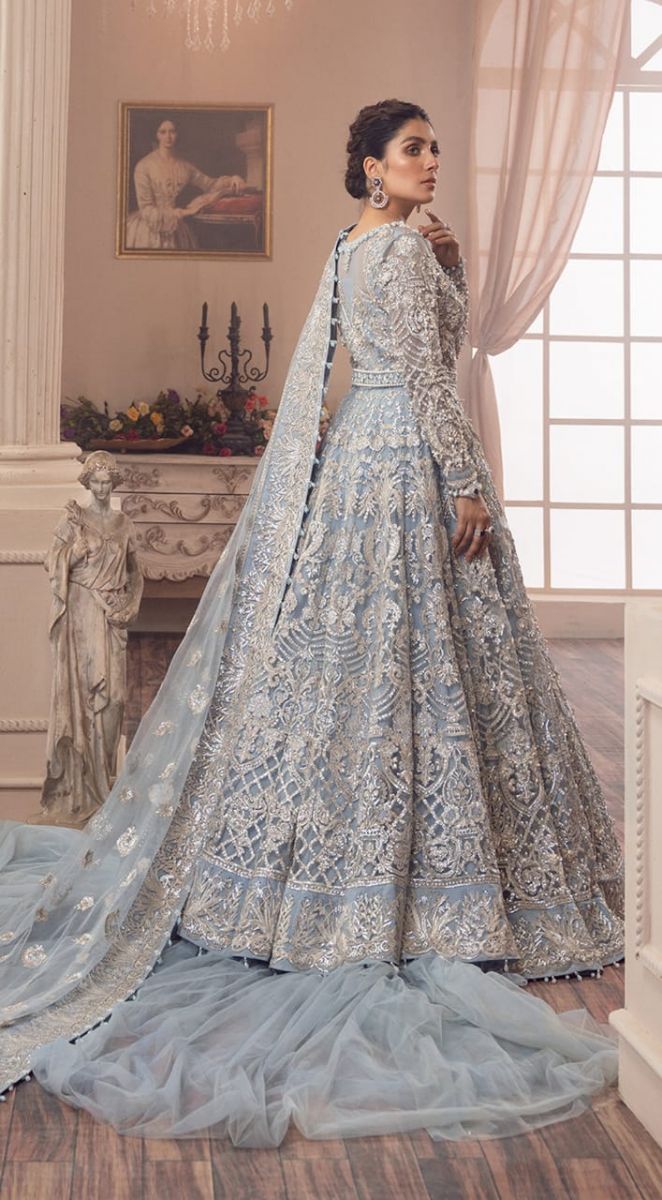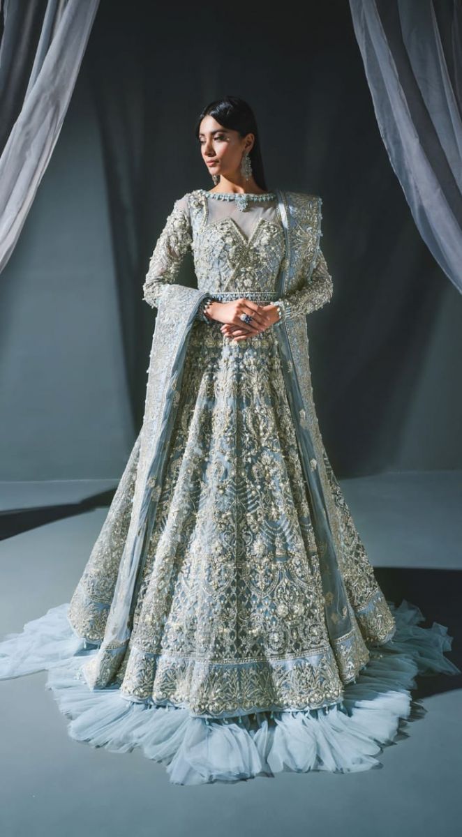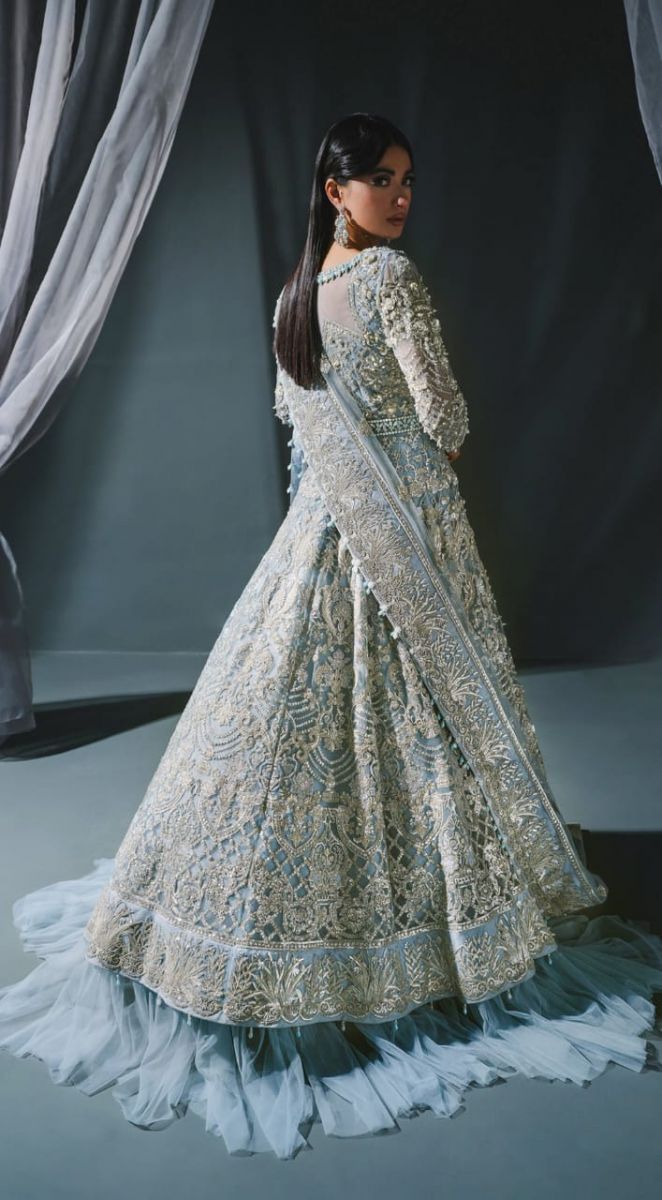 A beautiful Sky Blue Maxi with dupatta & belt, ensemble with pearls and stones work, featuring "dabka embellishment highlighted with sequins.