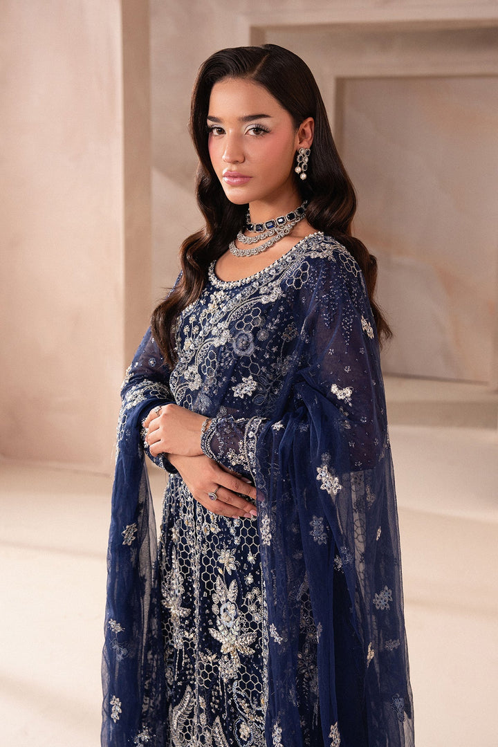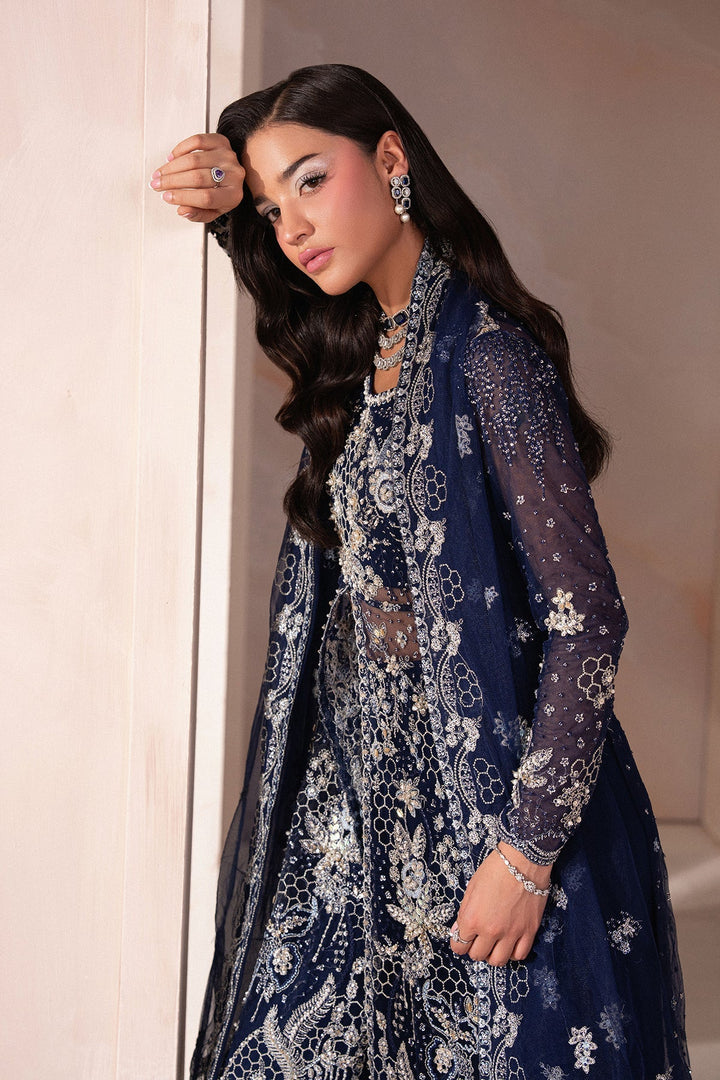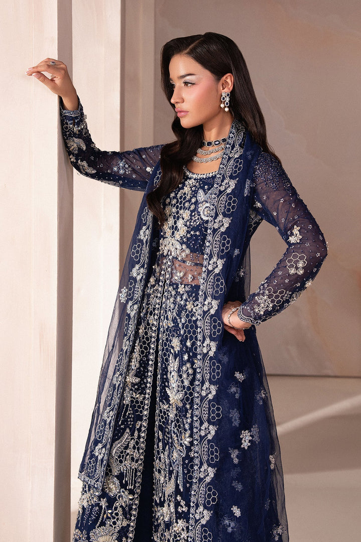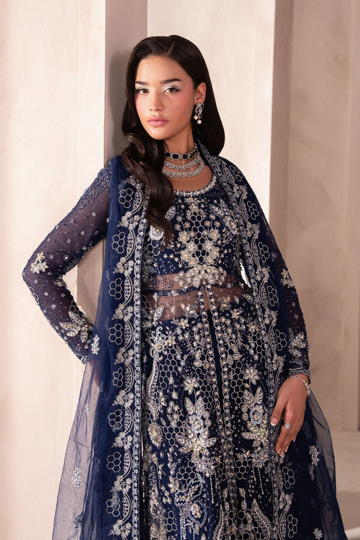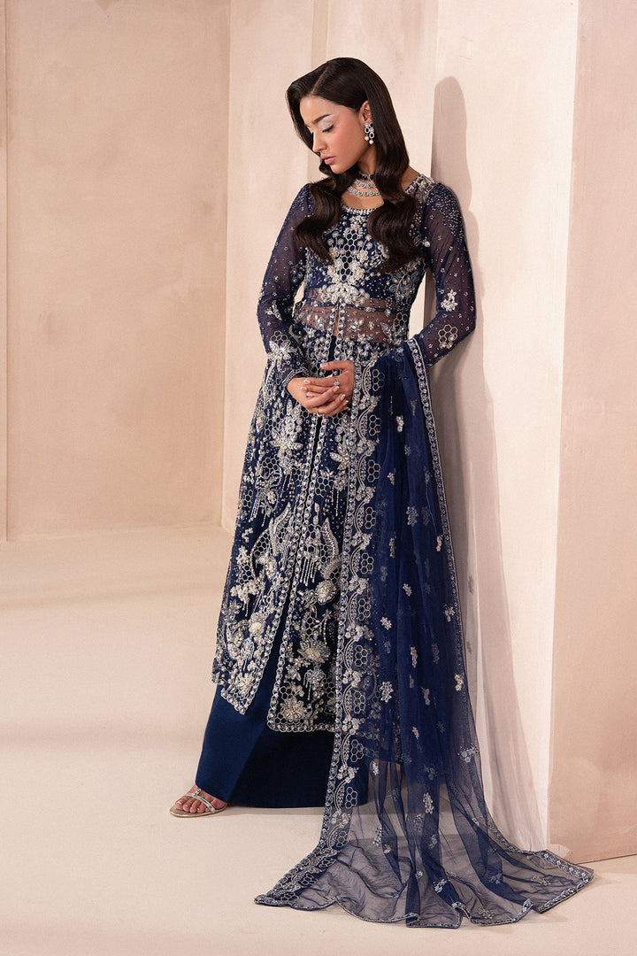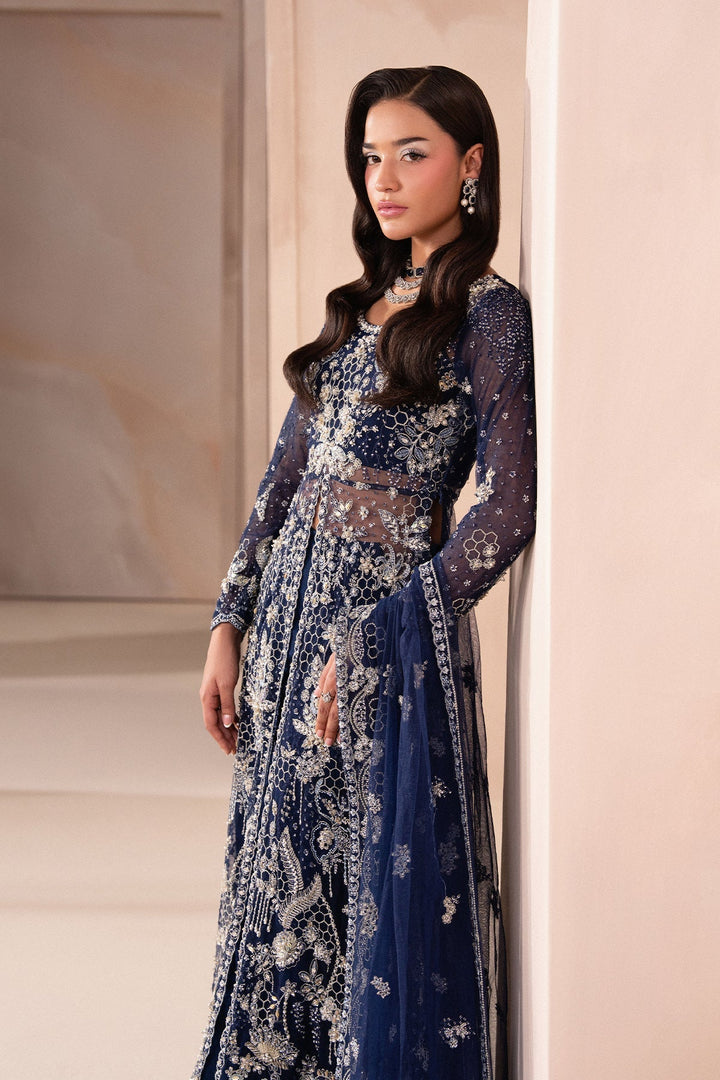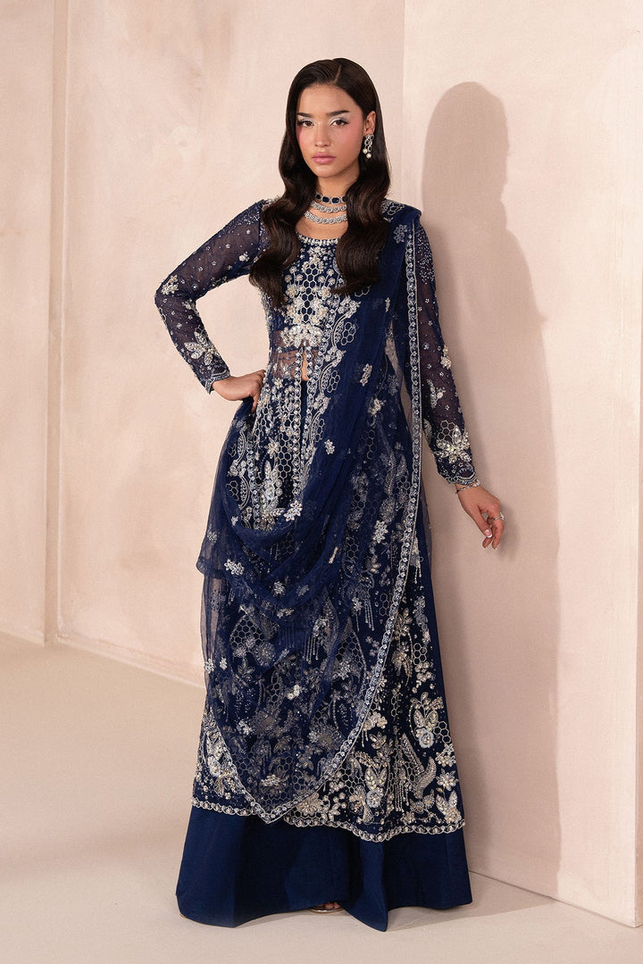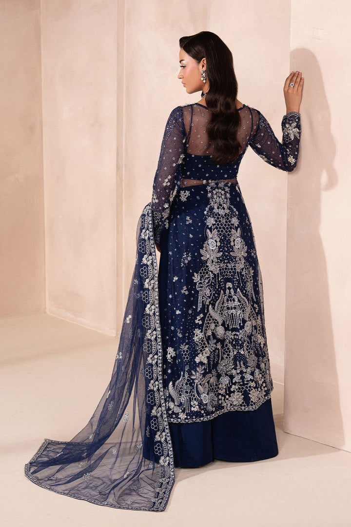 - A Regal Navy Blue ensemble featuring a long, front-open shirt made from net fabric, flowing elegantly with a sheer, airy charm. The shirt is paired with flared pants, adding movement and a modern silhouette to the look.