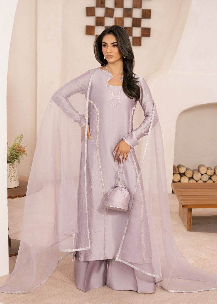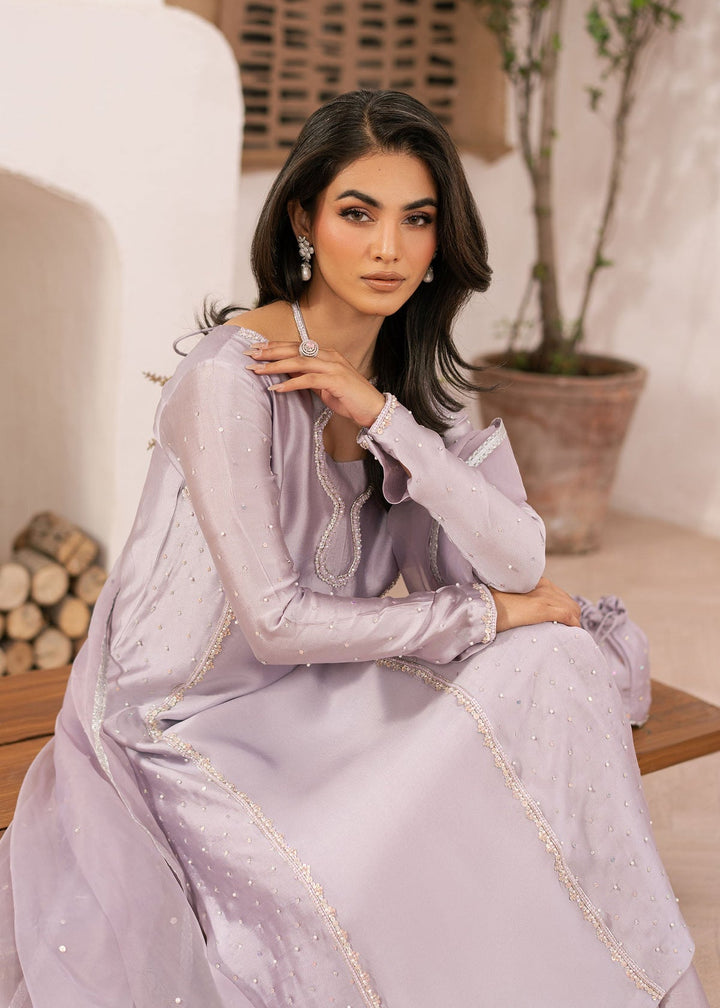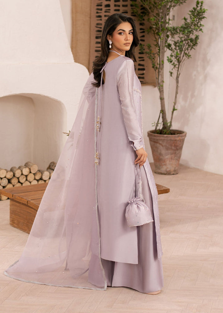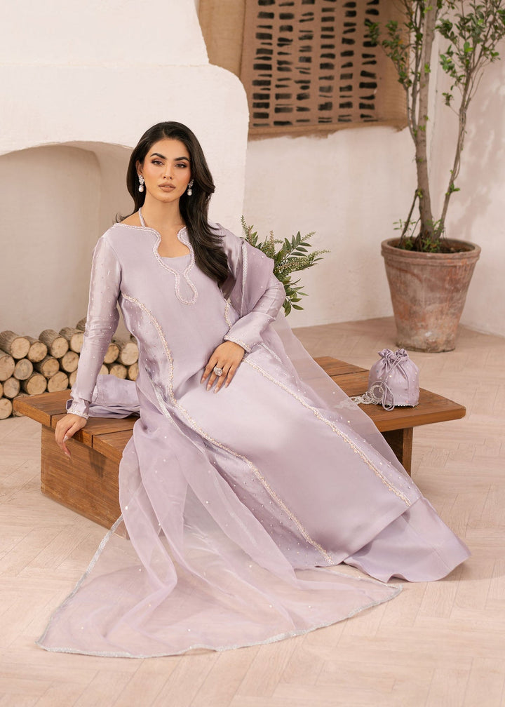 A gentle ode to spring, this lavender set features a tissue silk shirt and trouser, adorned with intricate detailing. The airy organza dupatta adds a touch of romance, making this ensemble ideal for intimate gatherings and festive occasions.