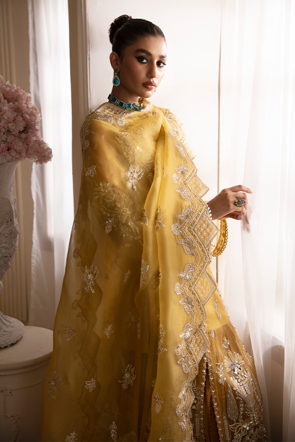 - Introducing the Aurea Shirt, a radiant ensemble in vibrant mustard yellow. This outfit features an organza shirt beautifully adorned with floral embroidery and sequin embellishments. Paired with stylish crimp sharara, it exudes a perfect blend of elegance and contemporary flair. The organza dupatta, bordered on all sides, completes the look. Ideal for special occasions, the Aurea Shirt captures the essence of tradition with a modern twist.