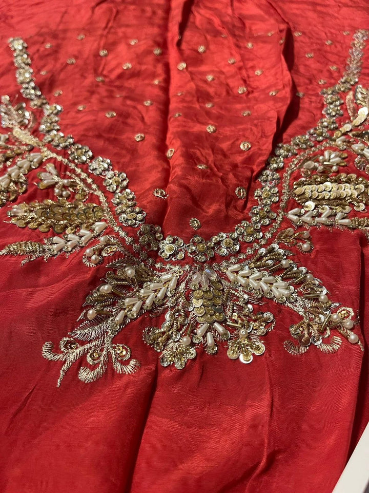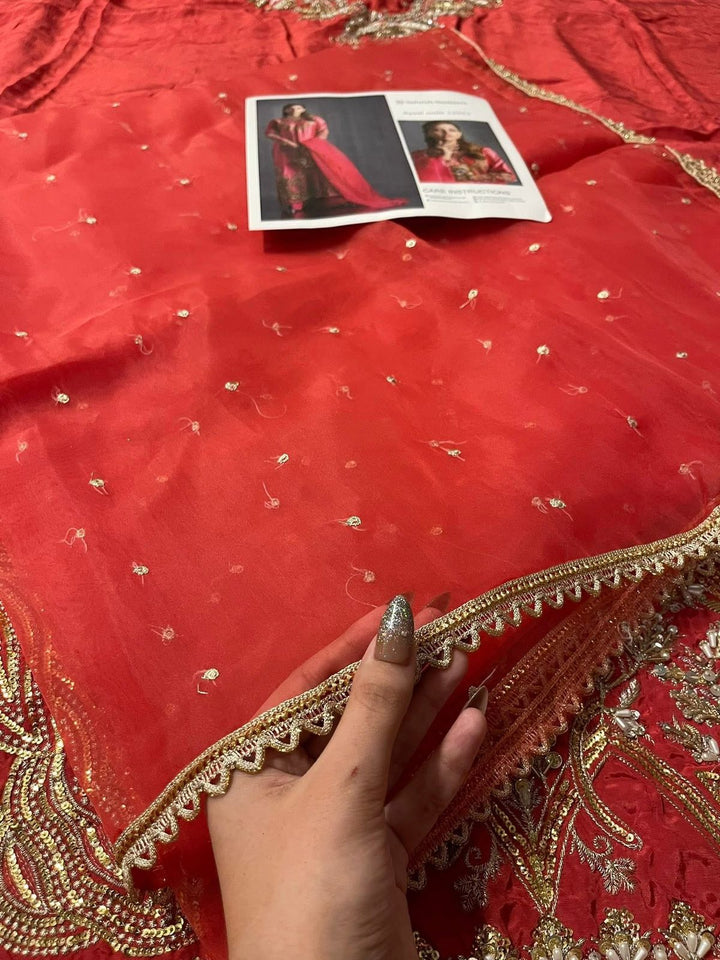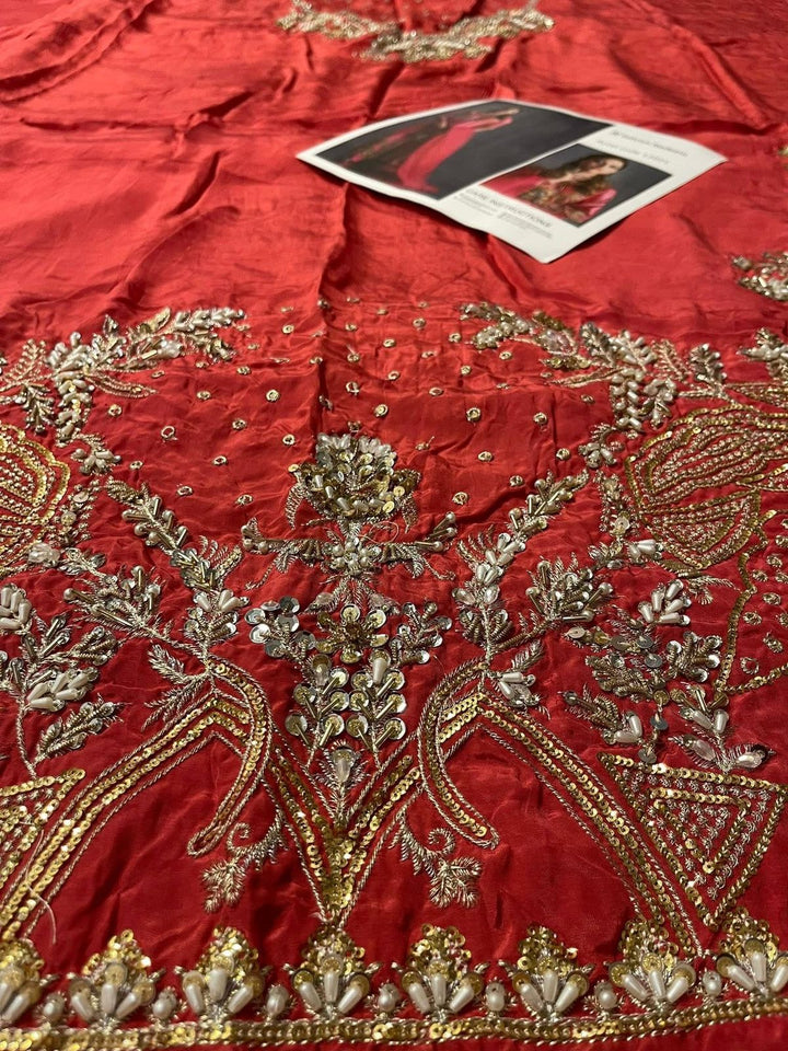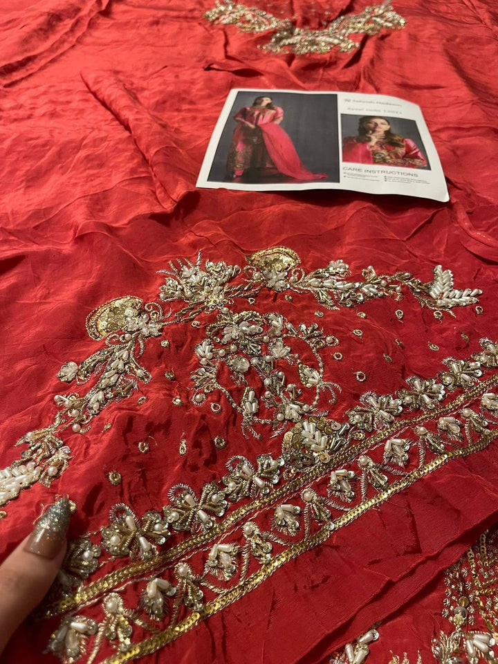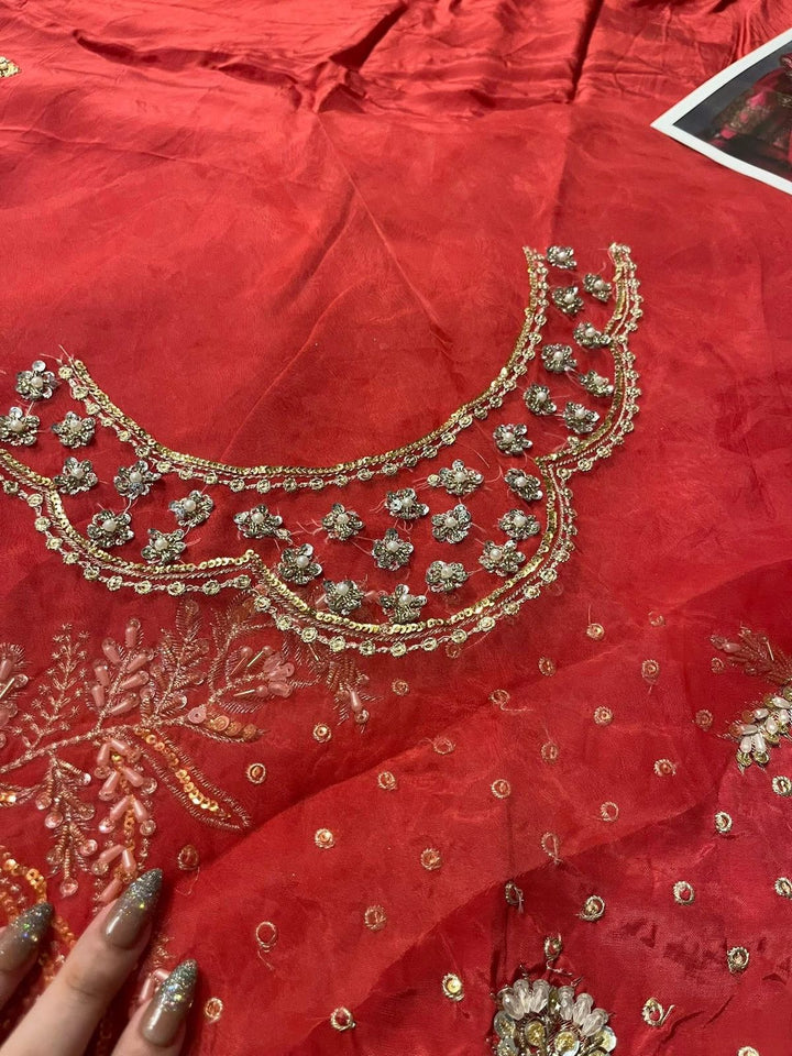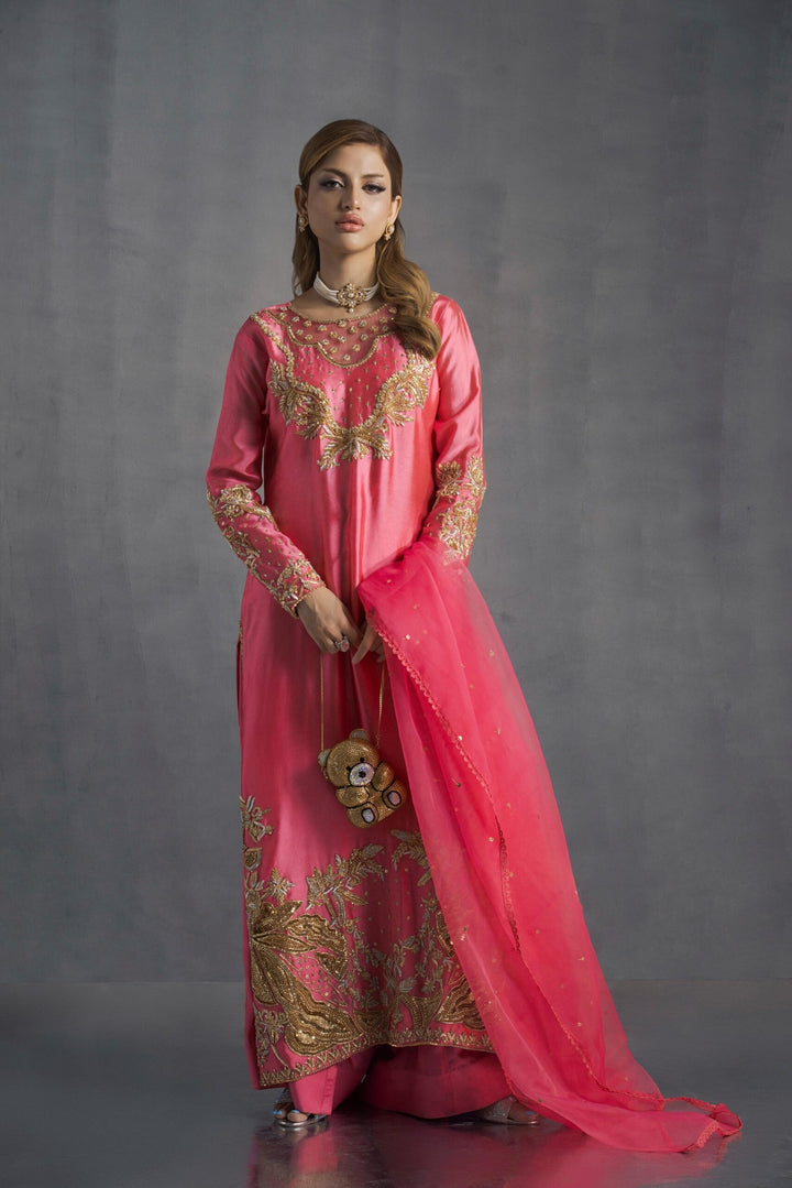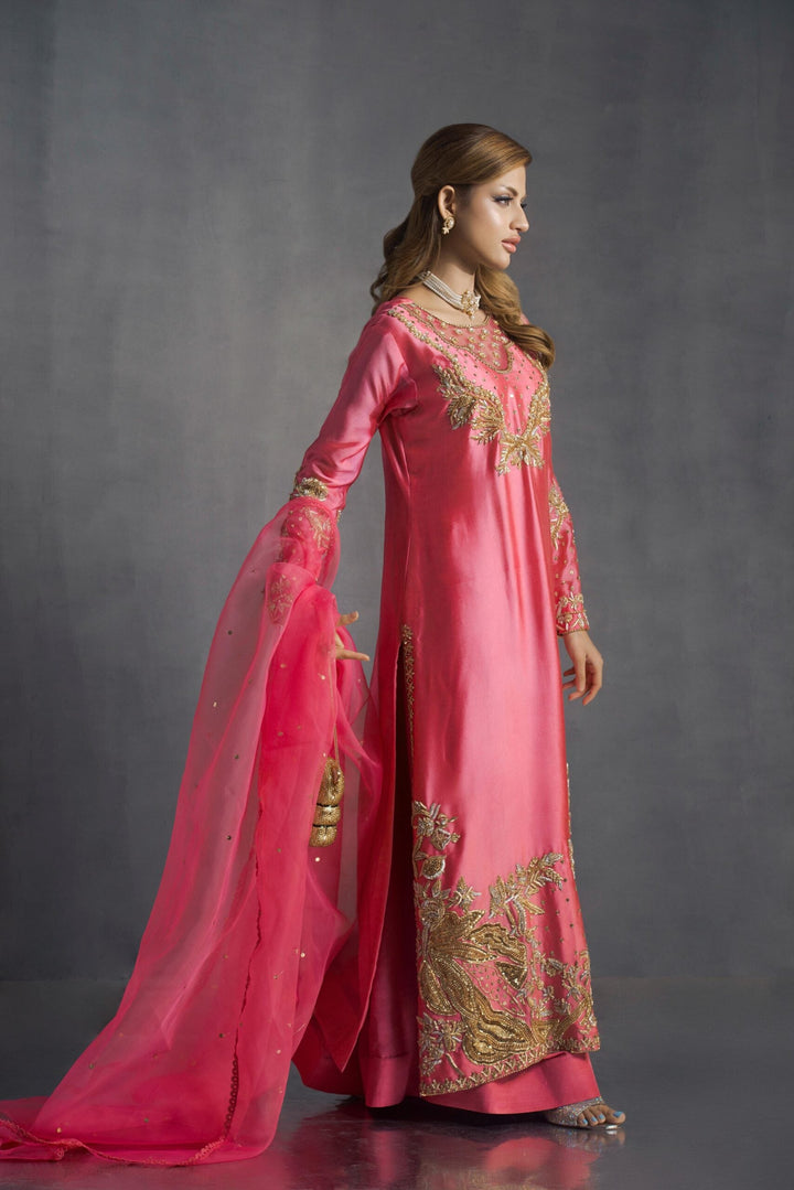 - Immerse yourself in luxury with an ensemble featuring a radiant bubble pink silk shirt handloader with floral artistry embroidered with intricate gota dapka and crystal accents. Paired with a delicate bubble pink toned azar pant . A cascading organza dupatta with french lace borders emanates understated elegance-