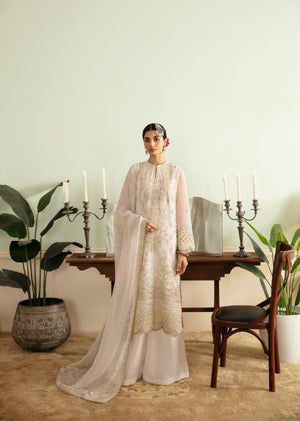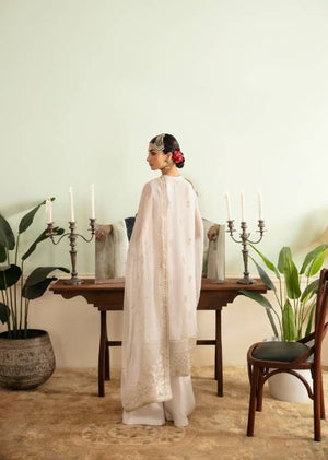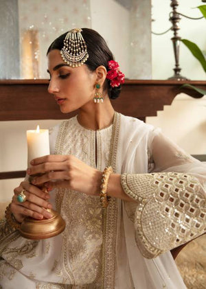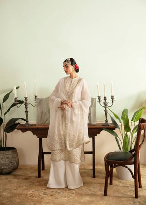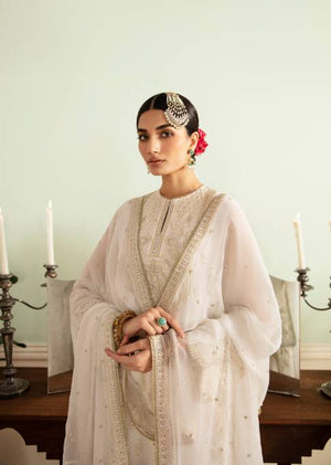 ELEGANCE IS REDEFINED IN THIS WHITE DRESS, WHICH FEATURES ETHEREAL FLORAL EMBROIDERY ON GRACEFUL CHIFFON FABRIC ADORNED WITH LIGHT GOLD SEQUINS AND CUTWORK. COMPLETED WITH AN EMBROIDERED CHIFFON DUPATTA AND PANTS, CREATING AN INTRICATE BLEND OF MODERNITY AND TRADITION.