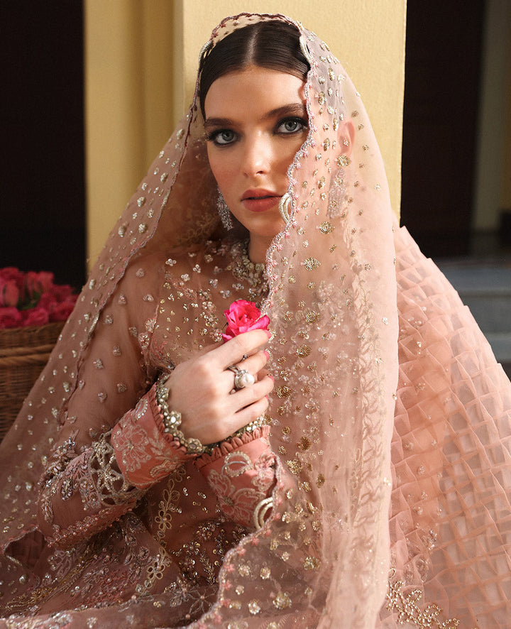 A fairytale dusty pink adorned with glowing embellishments, the silver tilla and sequin all etched in an enchanting floral pattern with sparkling shades and hues of pink in between. The heavy adda work gives it a luxury vibe yet the soft colour palette balancing it into a feminine dress.