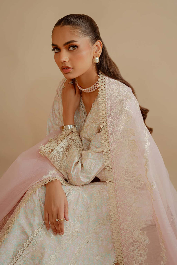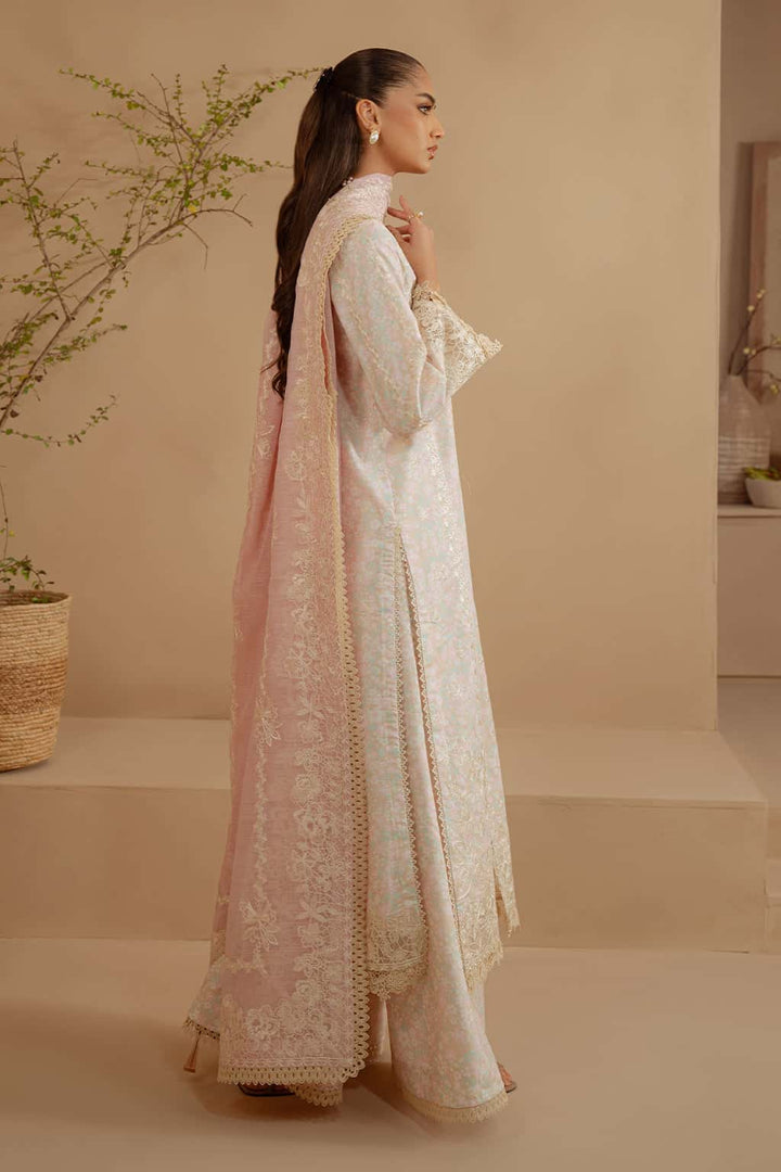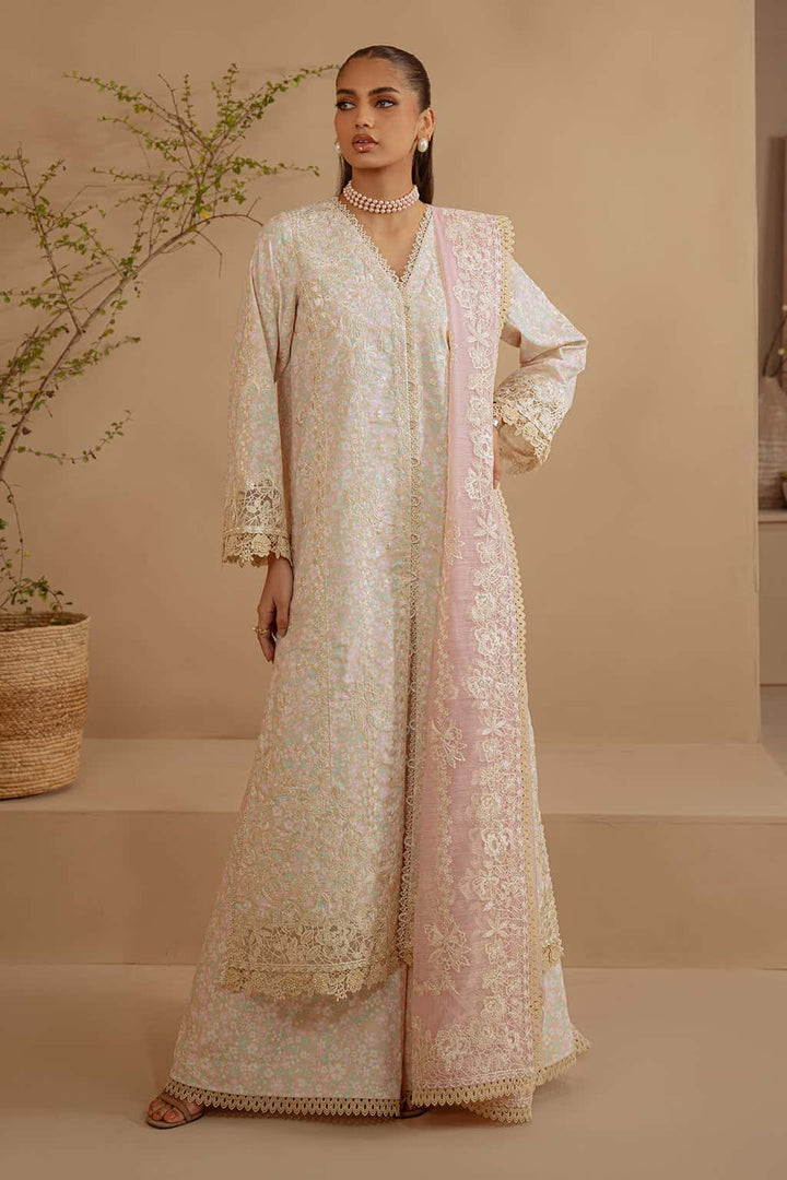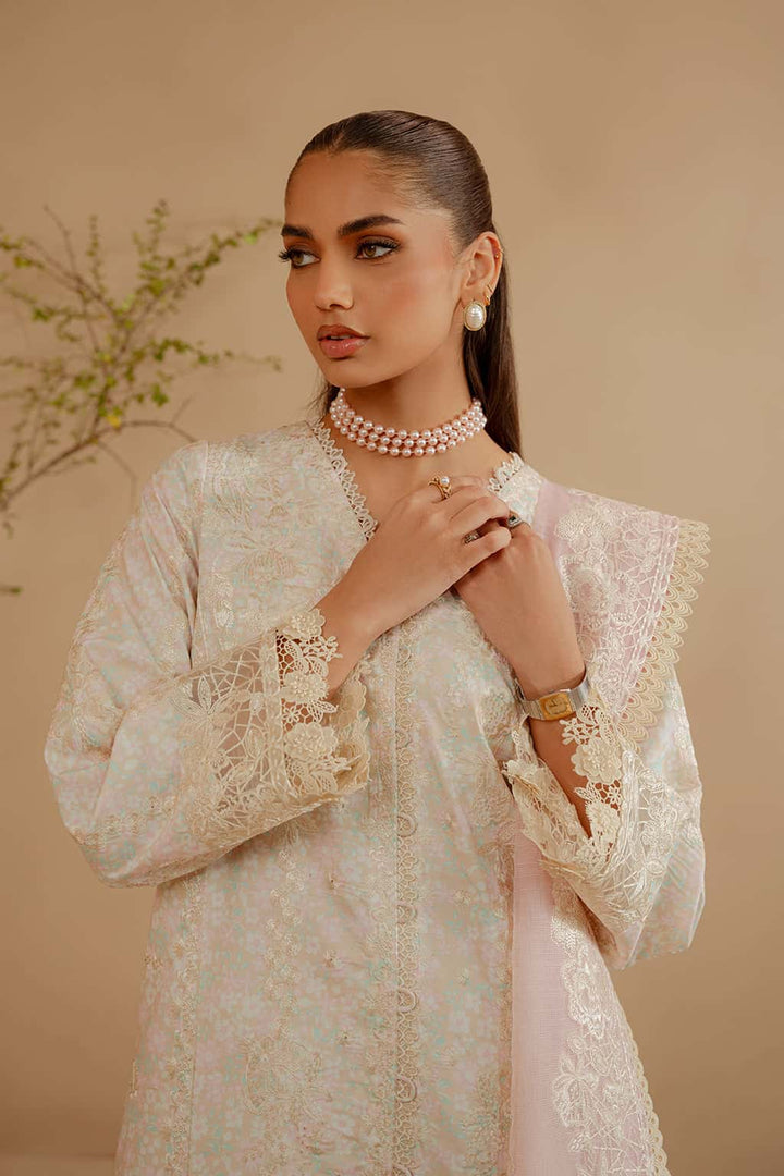 This exquisite stitched three-piece off-white ensemble is a timeless expression of elegance and sophistication. Crafted from stunningly printed premium khaddar fabric, the outfit features a charming floral embroidered shirt enhanced with delicate lace accents and intricately embroidered sleeves, adding a touch of uniqueness. Paired with printed trousers and a soft cotton slub pink embroidered dupatta, this ensemble beautifully combines grace with cultural richness.