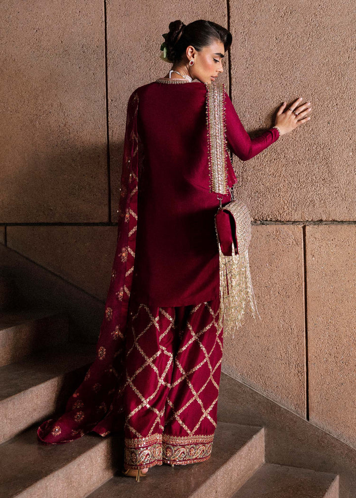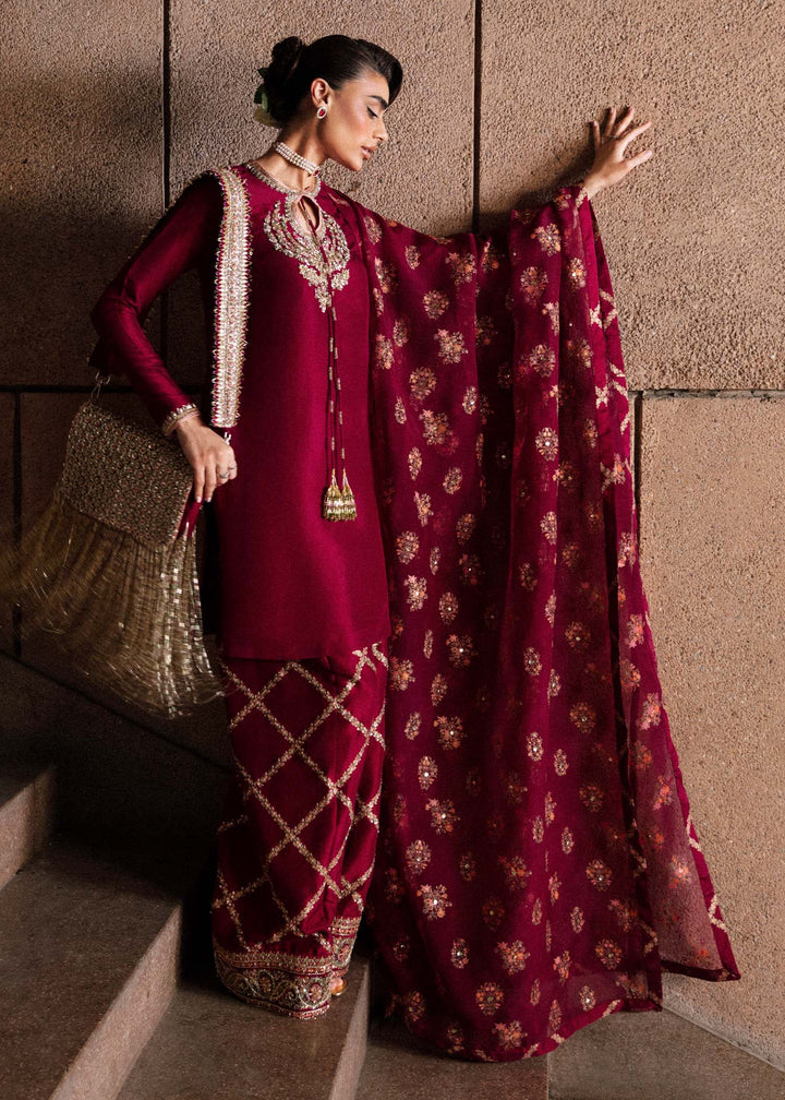 A ravishing burgundy maroon ensemble including a beautiful short raw silk shirt with embellishment detailing on neckline. The neckline is also adorned with gold sequins and naqshi with green , gold and pink buggle beads. It is paired with heavily embroidered and embellished shalwar. It comes with printed organza dupatta with block printed finishing on all four sides.