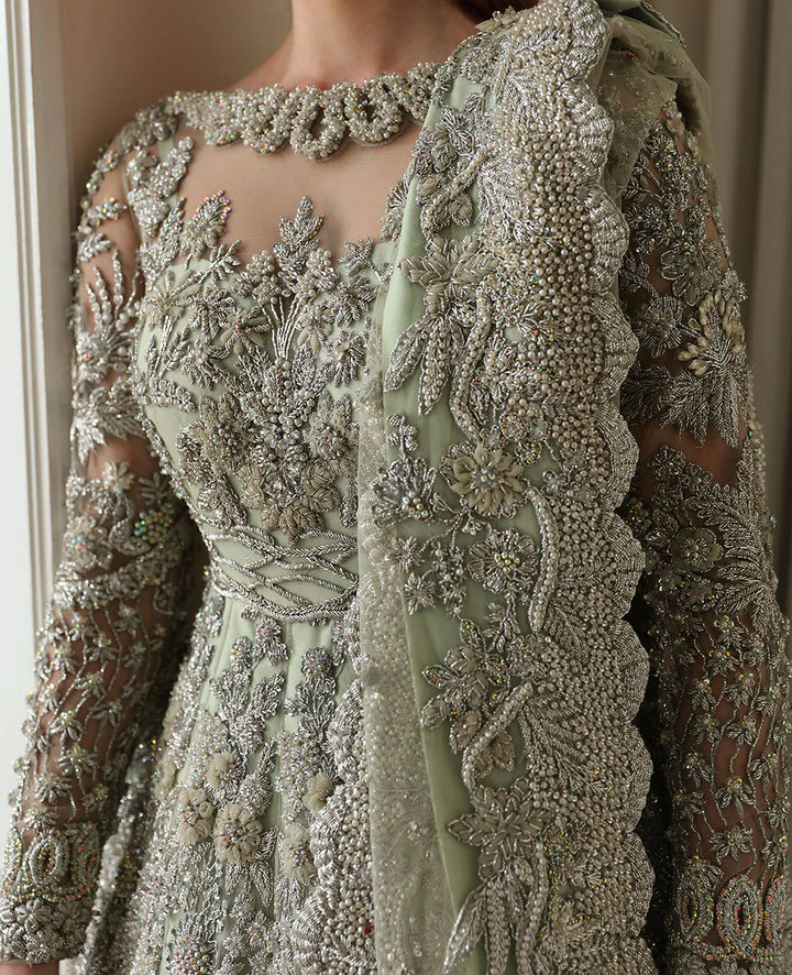 Celestia features a boat neckline gown with heavy jewel details and a scalloped dupatta. The design is inspired by palm trees and starry motifs, blending French floral elements with bethki and naqshi work. The gown is further embellished with kora, dabka, resham tilla work, Swarovski sequins, and cutdana.