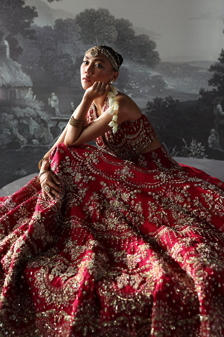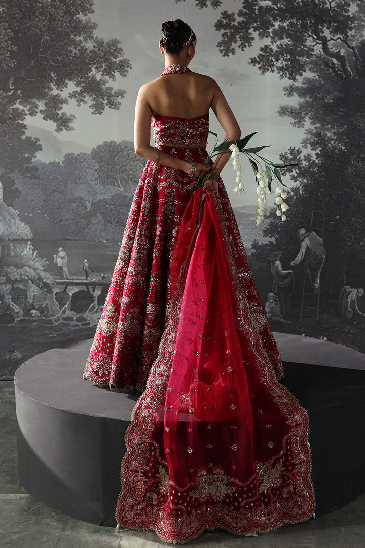 Step into the timeless charm of ?Claude? a captivating deep pink lehenga choli ensemble masterfully designed with sumptuous organza fabric. The choli boasts a contemporary neckline and is adorned with a stunning array of intricate embellishments. The lehenga is brought to life with modern embroidered panels, artfully arranged with pearls, moti, tilla, dull gold sequins, and subtle accents of cut dana, creating a breathtaking display of craftsmanship. Completing the ensemble is an airy organza dupatta, featuring a broad floral border and a sprinkling of complementary-hued embroidery and sequins, making it an unforgettable choice for brides seeking a blend of tradition and modernity.