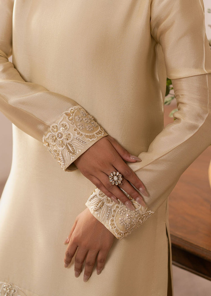 Gleam understated luxury in this pale yellow ensemble. Cut from premium tissue silk, the shirt and trouser exude a soft glow, while the organza dupatta brings a whisper of sophistication. Designed for those who appreciate timeless glamour.