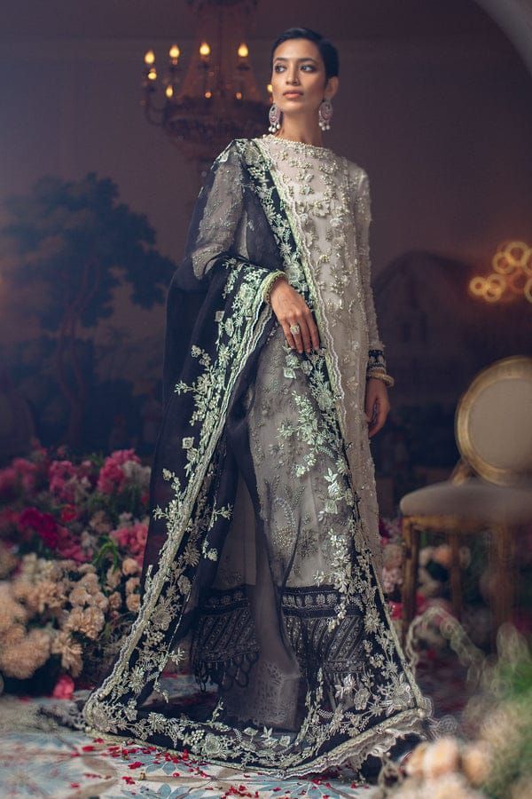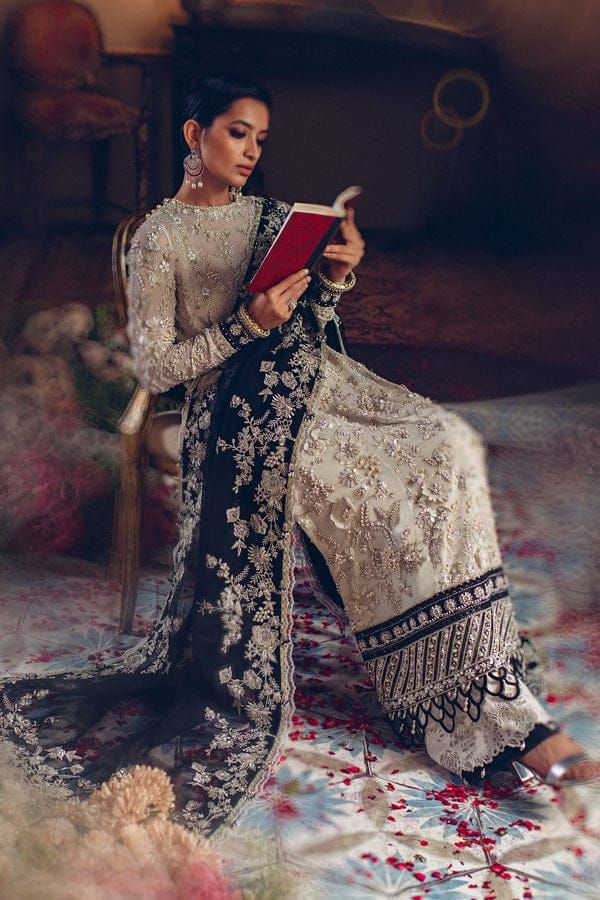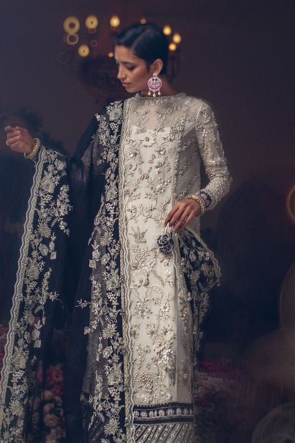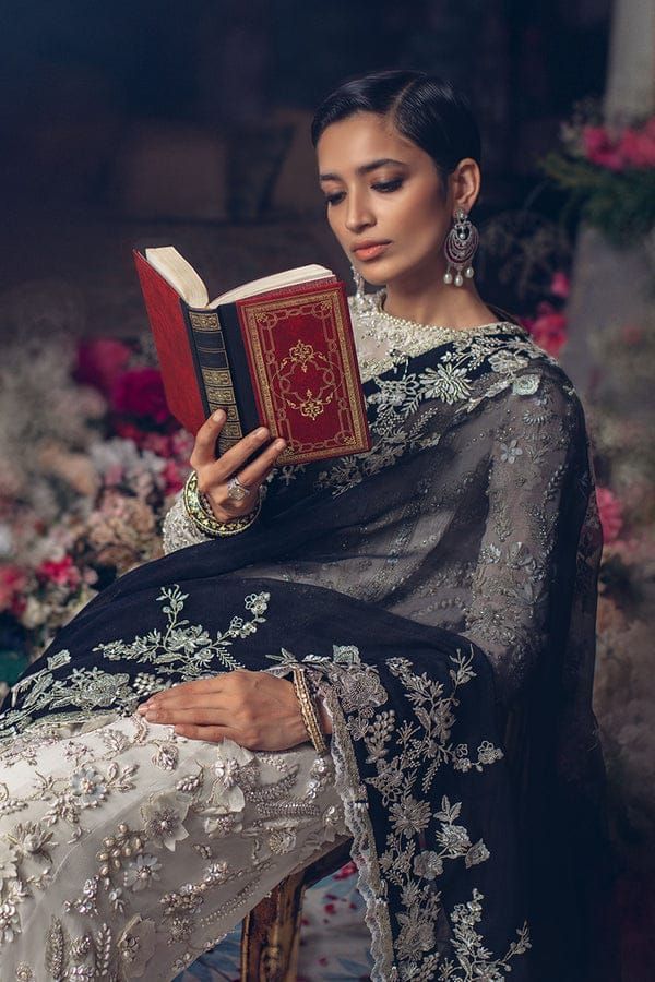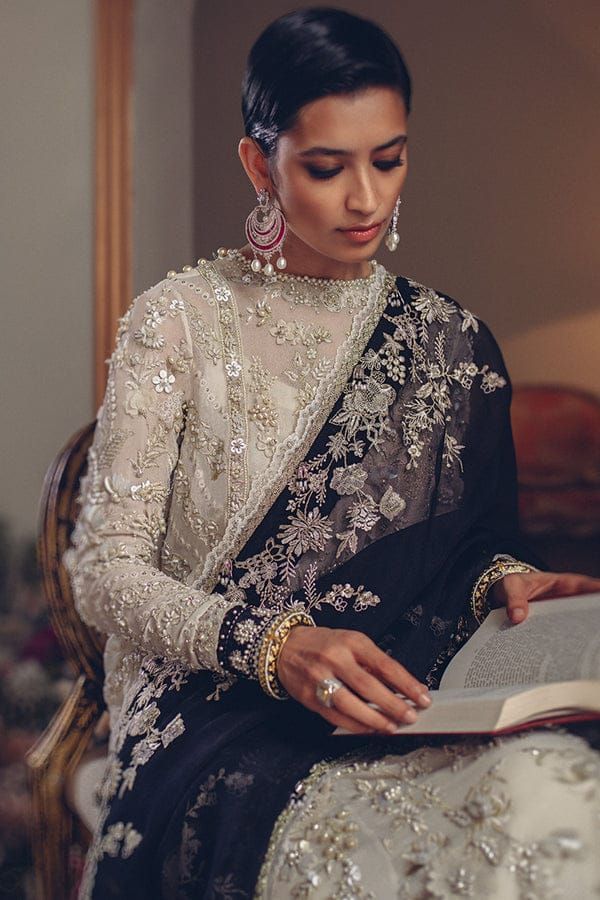Crafted on luscious chiffon canvas and hand embellished with 3D organza details to represent the quintessential Élan aesthetic in the Noir et blanc. The exquisitely curated look is further accentuated with a contrasting dupatta in ebony with accents of gold crochet lace and filigree borders adding glamour and oomph to the entire outfit.