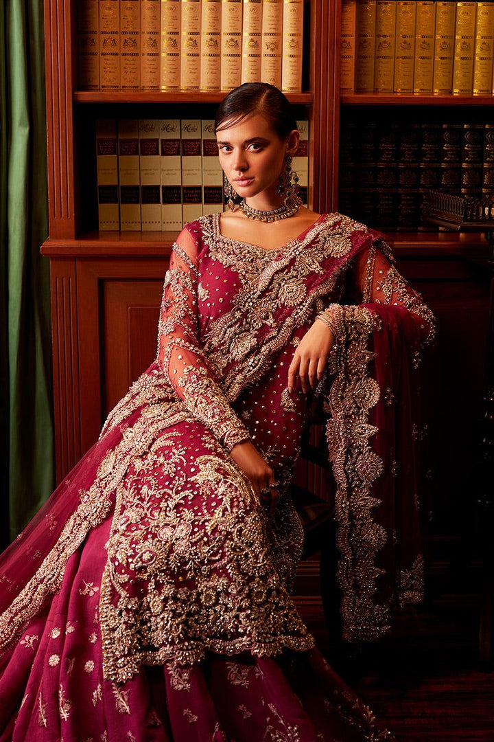 - Discover Elysia, a bridal outfit that captures the spirit of nature's beauty. The shirt is embellished with intricate motifs, handcrafted from delicate beadwork, sequins and naqshi detailing. The ensemble is adorned with cascading vines and blooming flowers thus creating a sense of enchantment and grace.? Elysia a perfect choice for the bride who wants to embrace her love for nature on her special day.