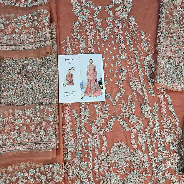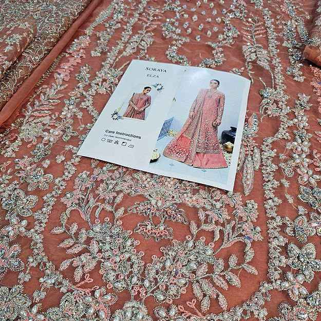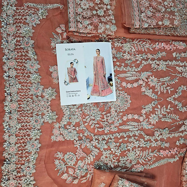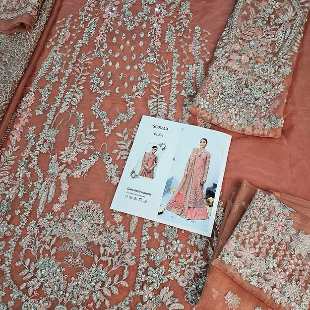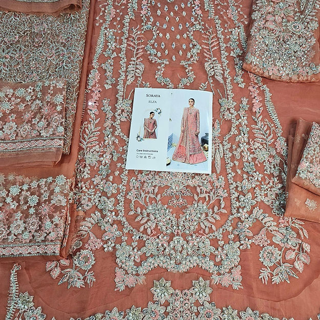 Crafted with a fusion of tradition and precision ?ELZA?, A stellar attire in peachy hue weaves into a whimsical tale of Elegance. This Peachy Net Shirt and dupatta flaunts delicate cutwork with a lavish floral border, a true work of traditional art. This intricate hand-embellished detail on the front and sleeves, showcasing the mastery of gotta, pearls, and katdana. Complementing the dreamy aura, foil-printed pants, and a slip, add a touch of sophistication, while the 3D floral net on dupatta seamlessly combine elegance with style.