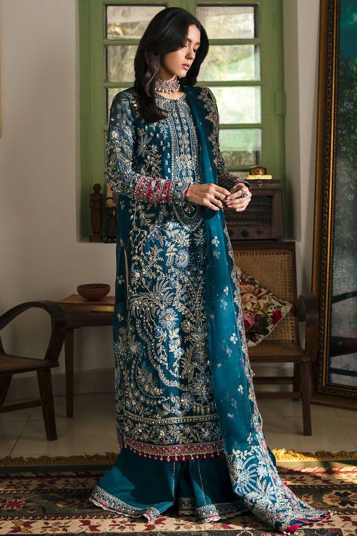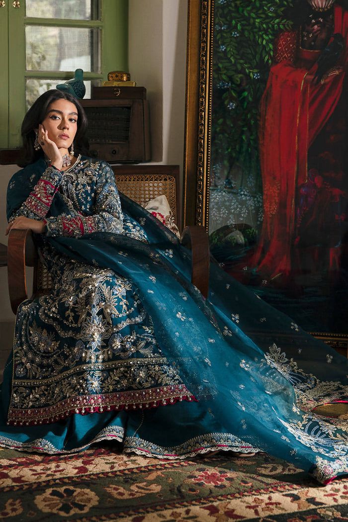 Diana is a gloriously curated silhouette serving festive fashion celestially with its appealing teal blue color and glinting adornments. An organza shirt and dupatta embedded with Fuschia pink hints and details of gota, crystals further fused with pearls and handwork details. Glistening silk pants are paired with it completing a quintessential festive look.