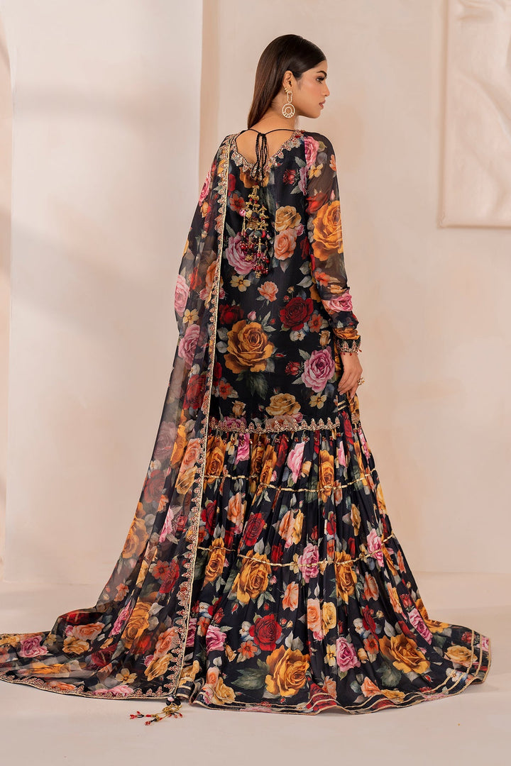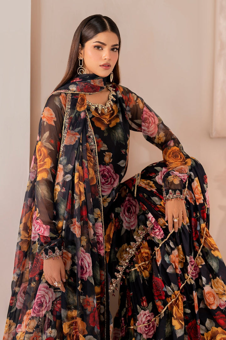 This digital printed chiffon set is a festival of colors, featuring a shirt gharara and dupatta that spill over with vibrant floral prints. Accompanied by an embellished neckline, detailed embroidered borders with sequins that adorn the sleeves, side vents, front & back hemline, and dupatta, it is paired with a digital printed silk gharara fabric that you can get stitched according to your preference.