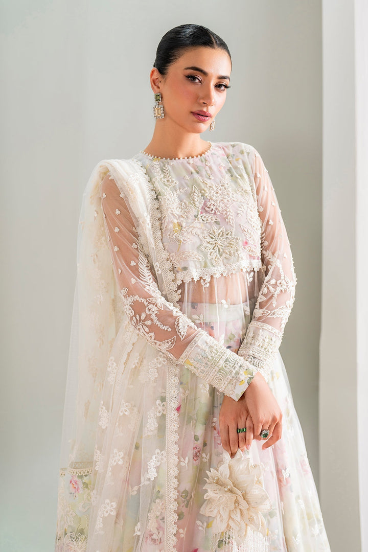 The net front and back of this product features transparent sequins & exquisite white-on-white embroidery, with handwork on the front body and borders of the sleeves. The dupatta is also embroidered on the borders with delicate digitally printed silk inners. The look is completed with dyed silk trousers.