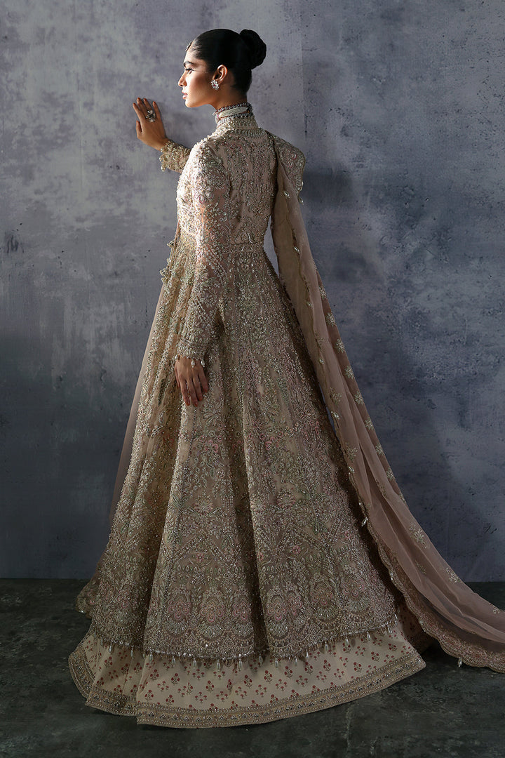 The magnificent peach-pink angrakha-style gown is a beautiful combination of modern appeal and traditional grandeur. This luxurious creation, crafted from opulent organza fabric, features intricate embroidered panels enriched with pearls, cutdana, and beadwork. Subtle accents of light gold tilla and shimmering golden sequins add a radiant touch. The ensemble is completed with an embellished organza dupatta, framed by an intricately embroidered border, exuding a modern yet everlasting grace.