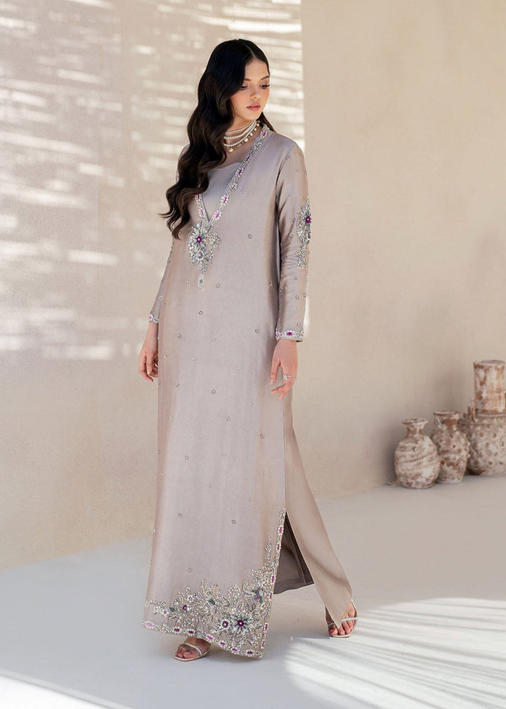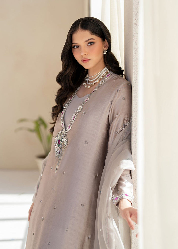In the serene nights of Eid, Eris, shines with understated elegance. This grey ensemble combines tissue silk fabrics with intricate hand embroidery and sequin work, complemented by an Organza dupatta. Ideal for those who crave timeless sophistication during the festive season!