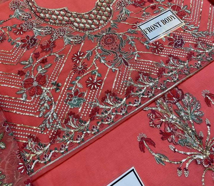 BAREEZE NET FULLY EMBROIDERED FRONT BODICE WITH TOTAL ADDA WORK SEQUENCE , MIRROR WORK, PEARLS, CRYSTAL, STONES ,BEADS & HEAVY SEQUENCE WITH ALL FANCY EMBROIDERY OF SEQUENCE,RESHAM , TILLA & THREAD EMBROIDERY.2 DAMAN EMBROIDERY PATCH FOR FRONT & BACK.