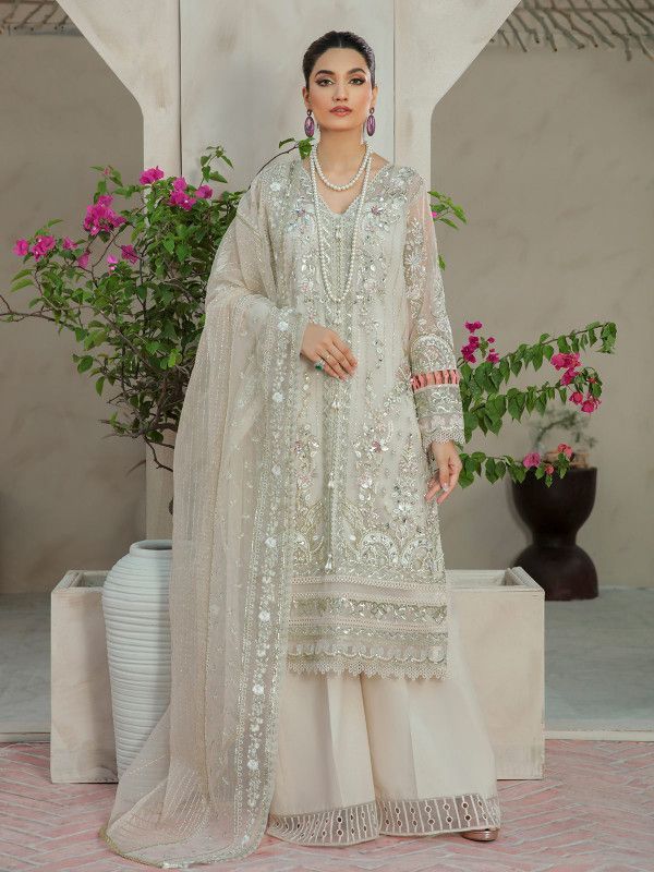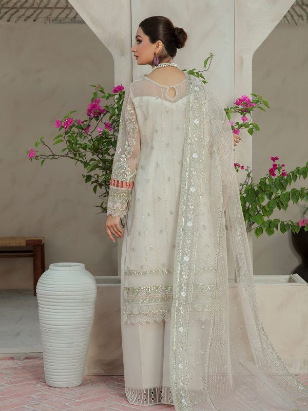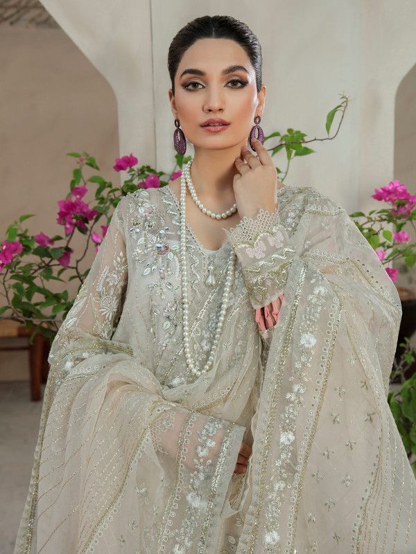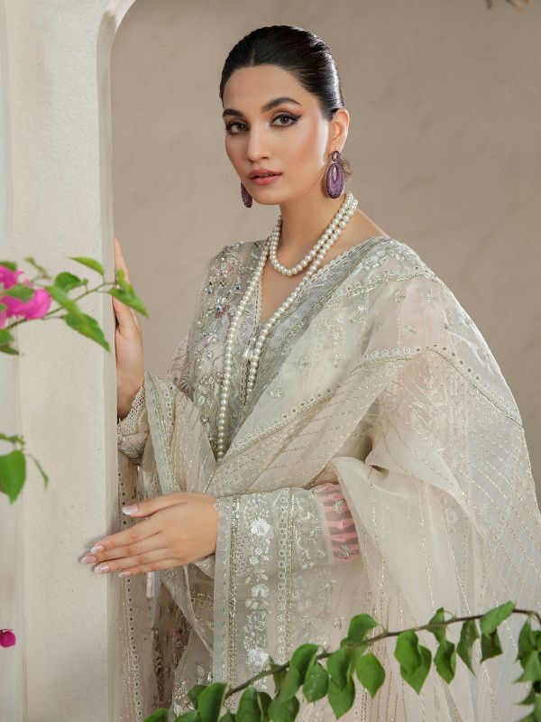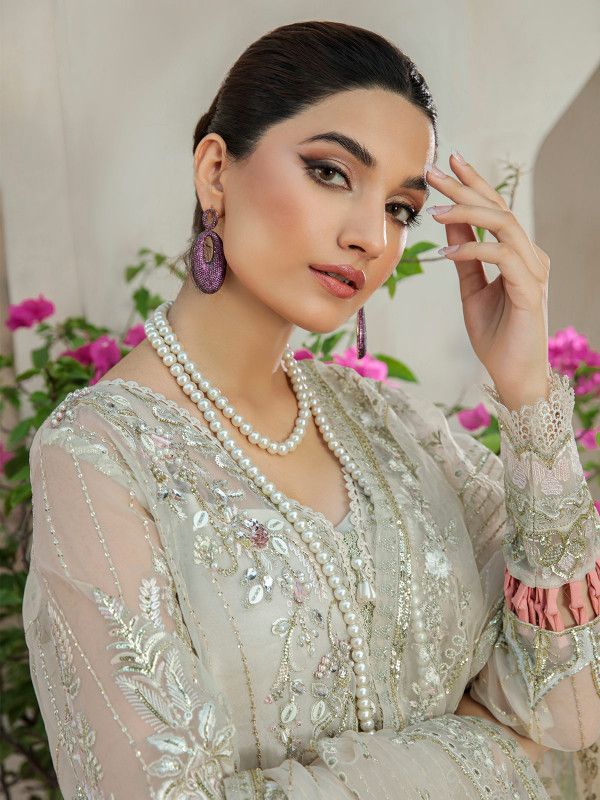 Yaram, item code GL-LP-22V1-06 from our luxury pret collection is one of our absolute favourite designs from this collection. Featuring our favourite white on white combination with a hint of pastel pink thread embroidery and signature hand-worked adda embellishments, the outfit is bound to make you stand out. Artistically composed and meticulously rendered in shades of dull gold zari and koli sequin detailing, the outfit comes with a fully linear-embroidered dupatta. An absolute treat to watch and wear. Pair with a pearly necklace to complete the look