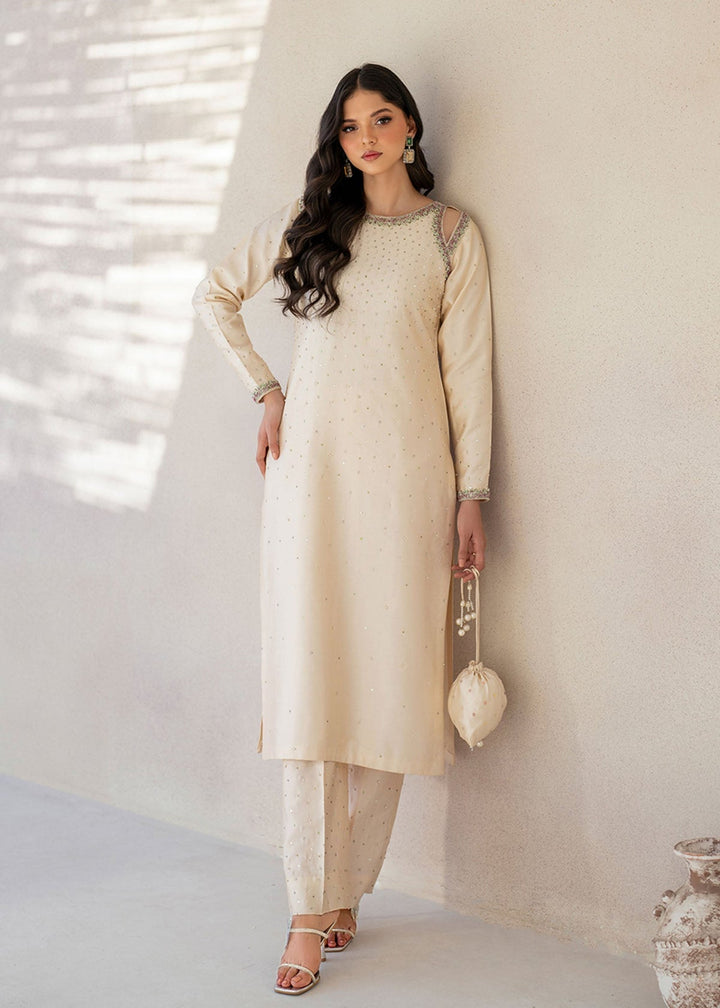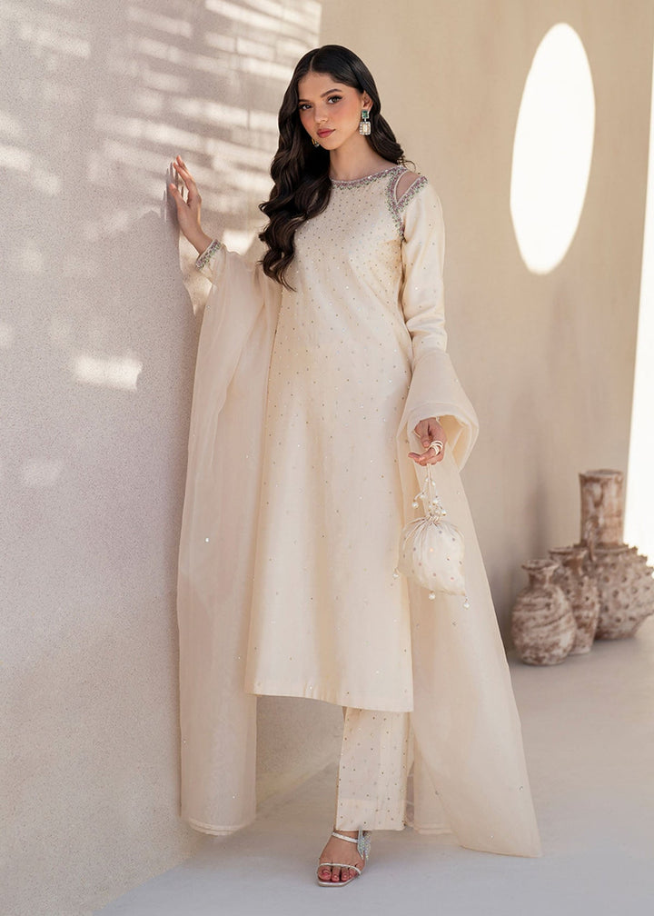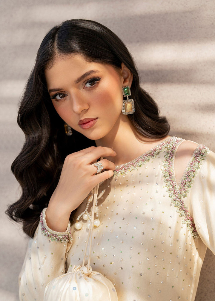Eid is a time for classic elegance, and Guzel embodies that spirit. This off-white outfit features tissue silk fabrics, adorned with intricate hand embroidery and sequin beads, complemented by an Organza dupatta. Ideal for those who crave timeless beauty during the festive season!