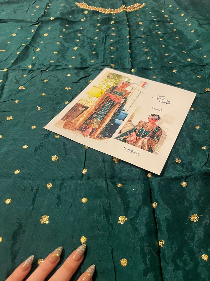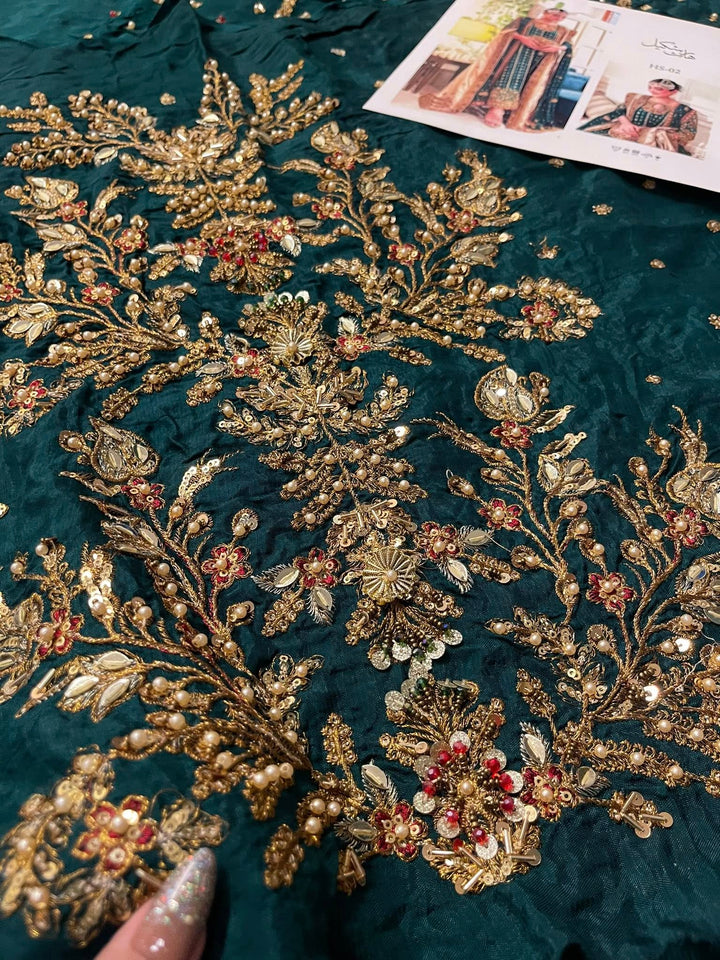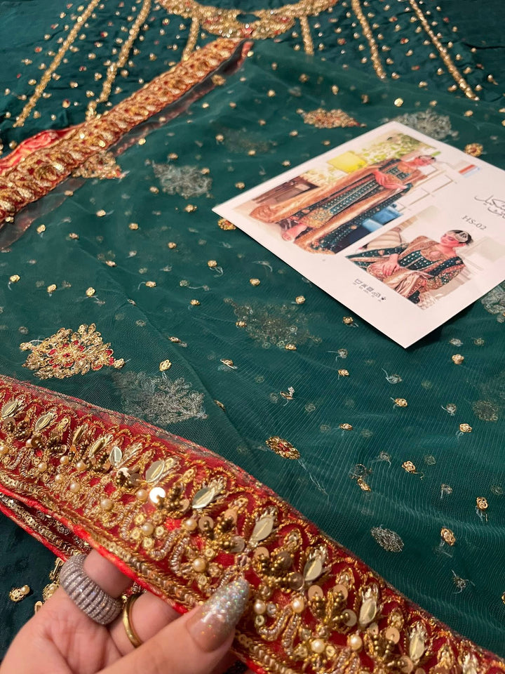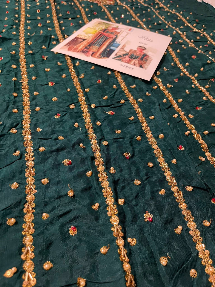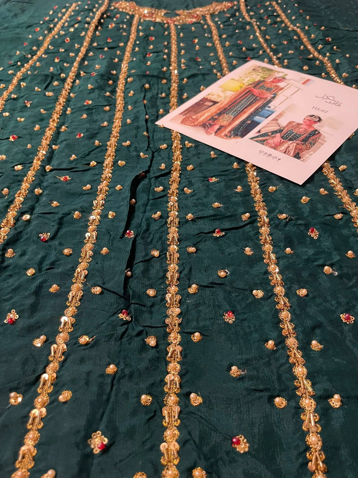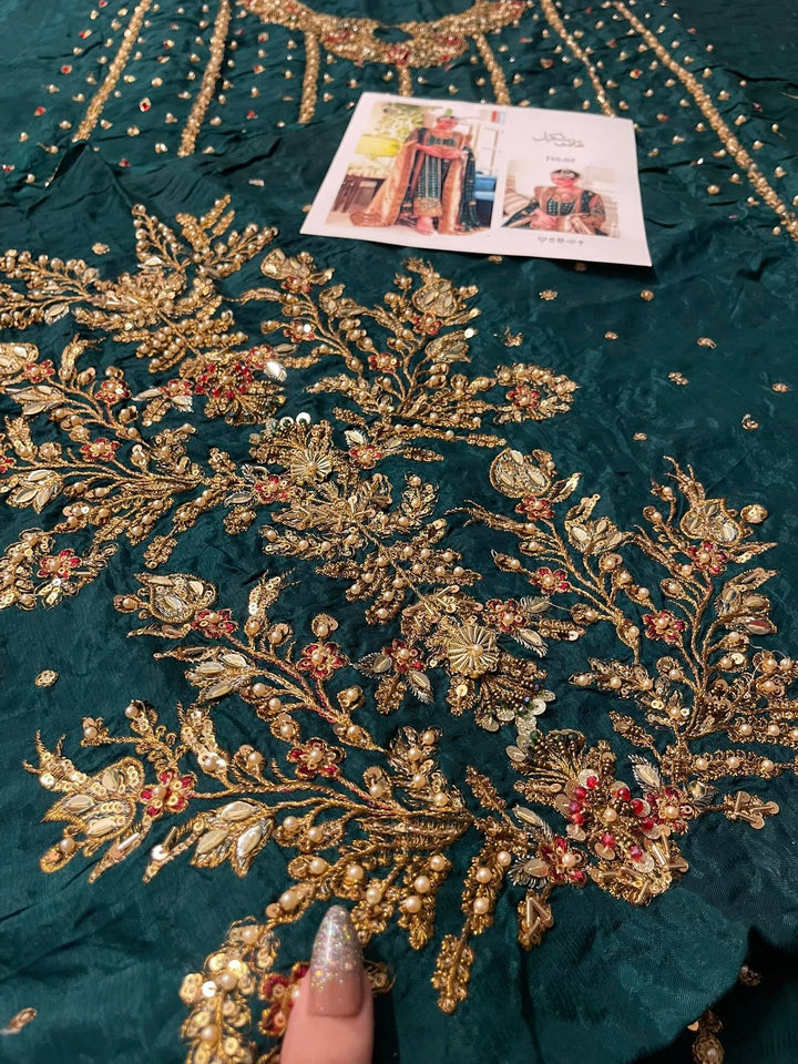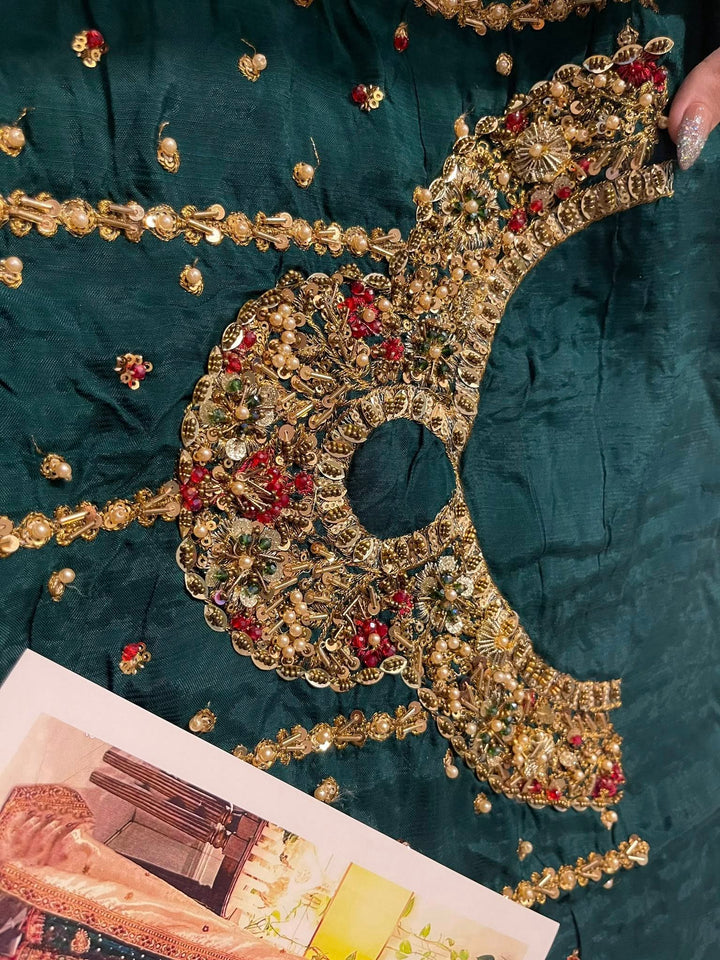 Mehrunissa A deep emerald ensemble adorned with antique gold and subtle marooon accents. The matching green dupatta, edged in ornate red/maroon borders, drapes in regal elegance, completing a look steeped in timeless tradition and quiet grandeur.