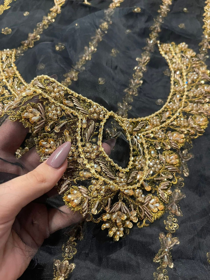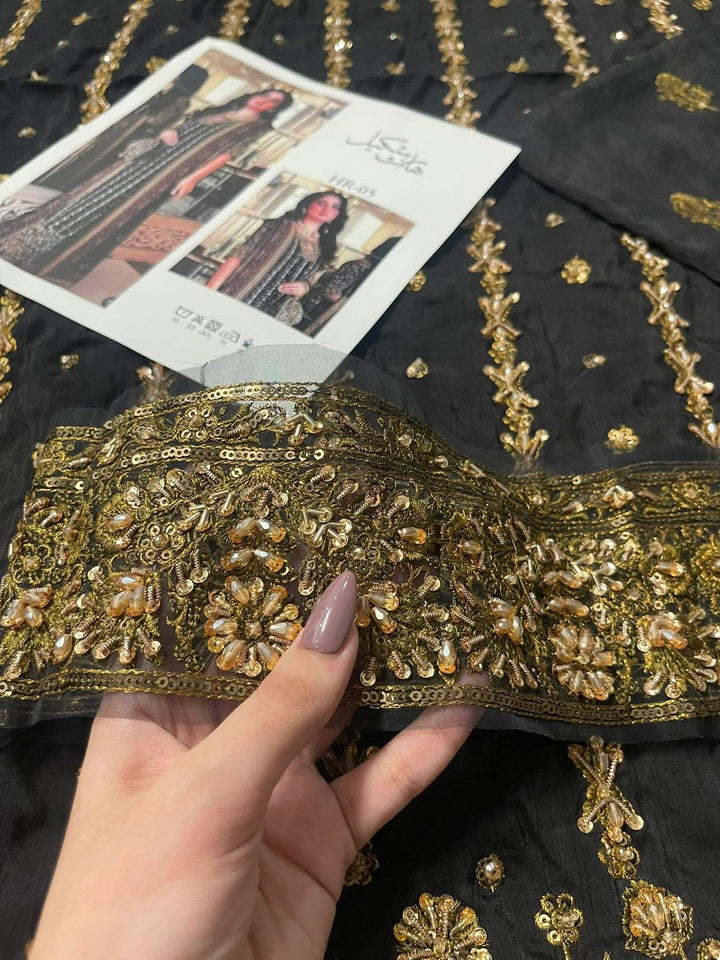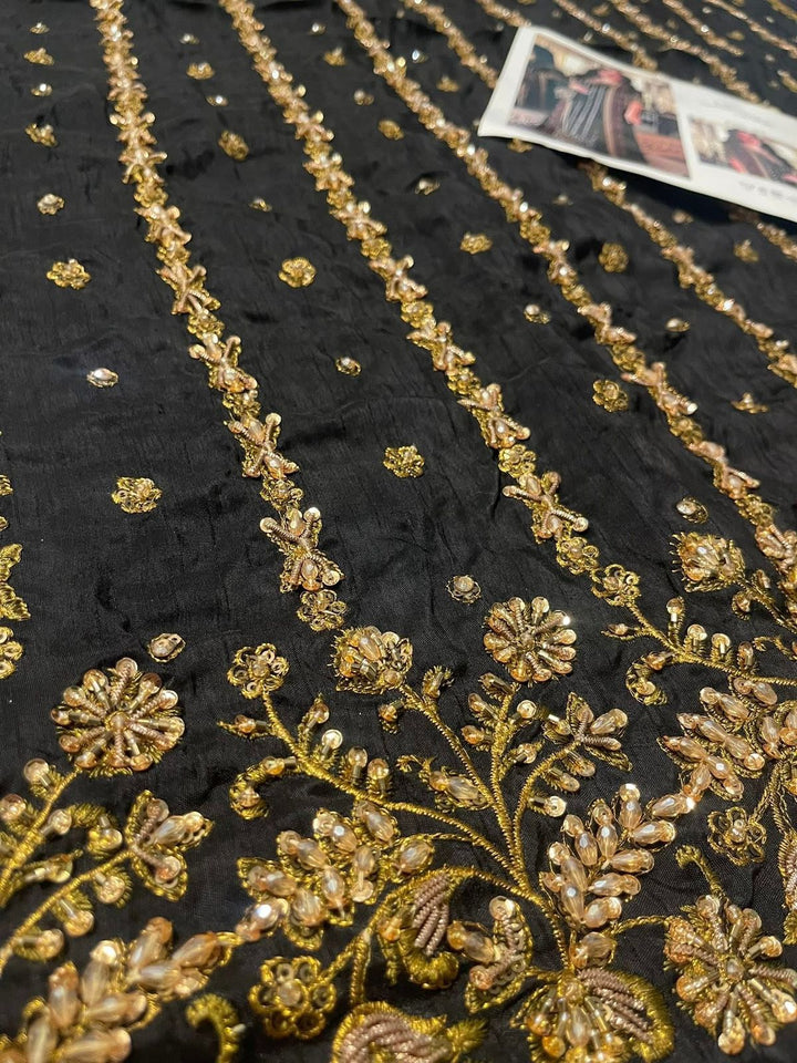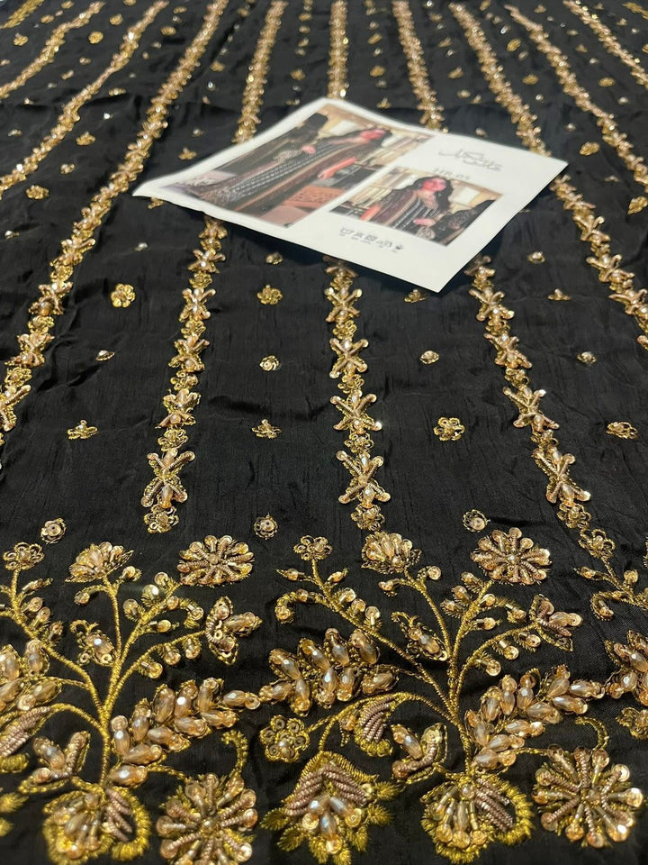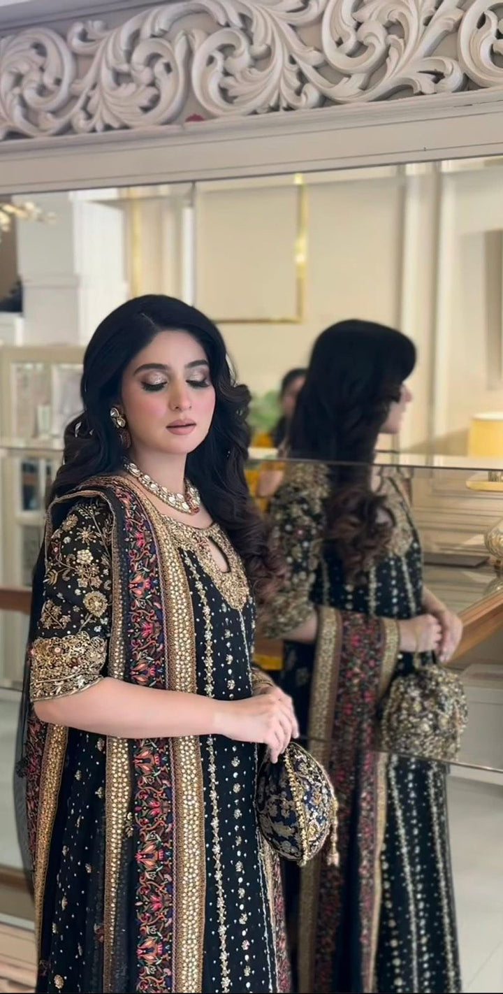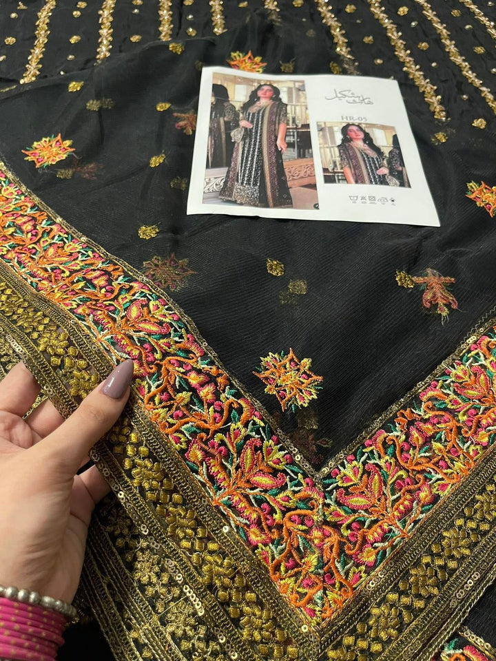 Step into timeless elegance with the Haris Shakeel zainab Embroidered Formal Dress. This breathtaking ensemble features a richly embroidered black base adorned with intricate floral patterns in vibrant hues. The outfit is paired with a beautifully designed matching dupatta, bordered with fine embroidery that enhances its luxurious appeal. Perfect for weddings, evening soirées, or festive gatherings, this masterpiece embodies a seamless blend of tradition and contemporary sophistication. Crafted to perfection, Haris Shakeel's design ensures you stand out with grace and charm.