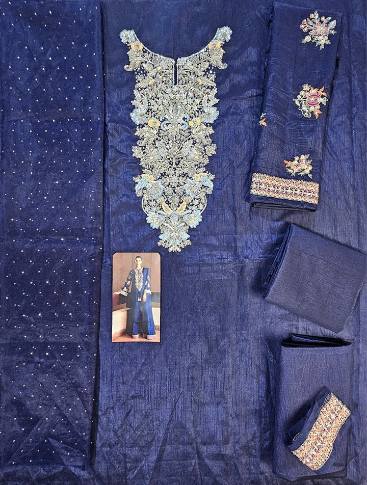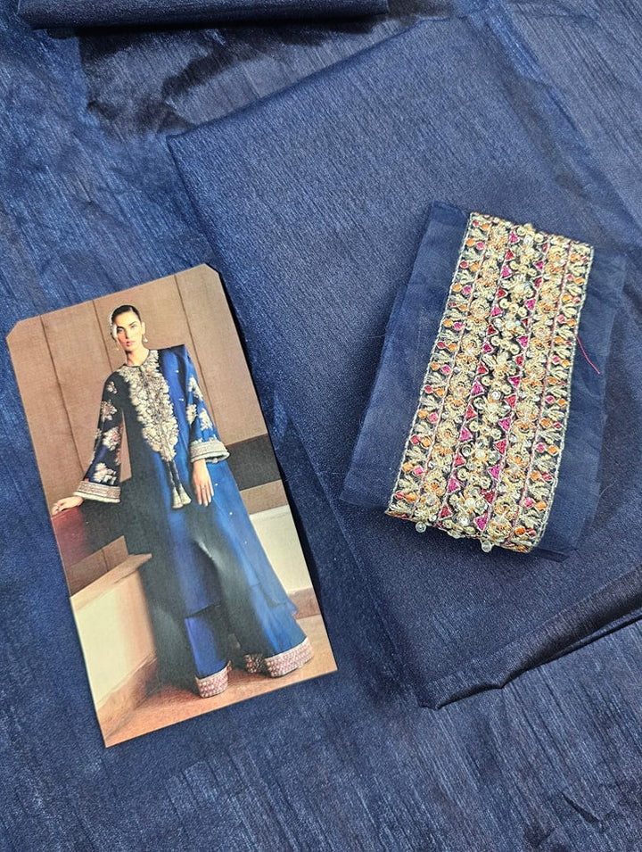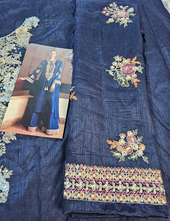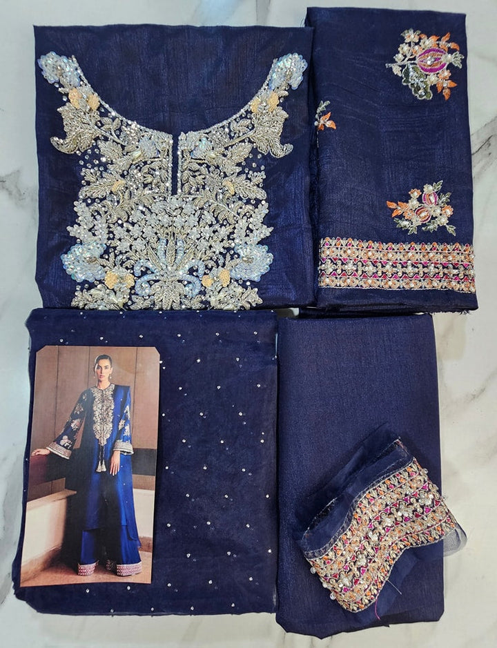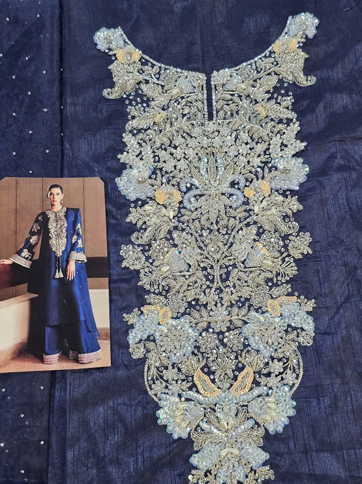 This classic navy blue raw silk long shirt has embellishment details of silver nakshi, sequins, gota, mukesh, orange, ice blue and green cut dana on neckline. The sleeves are heavily embellished with pink , orange and green sequins, cut dana and silver kiran at the hem. Its paired with red raw silk palazzo pants with borders embroidered and embellished with silver sequins, naqshi, buggle beads and pipes. The outfit contains 3 yards organza dupatta with sequin spray all over.??