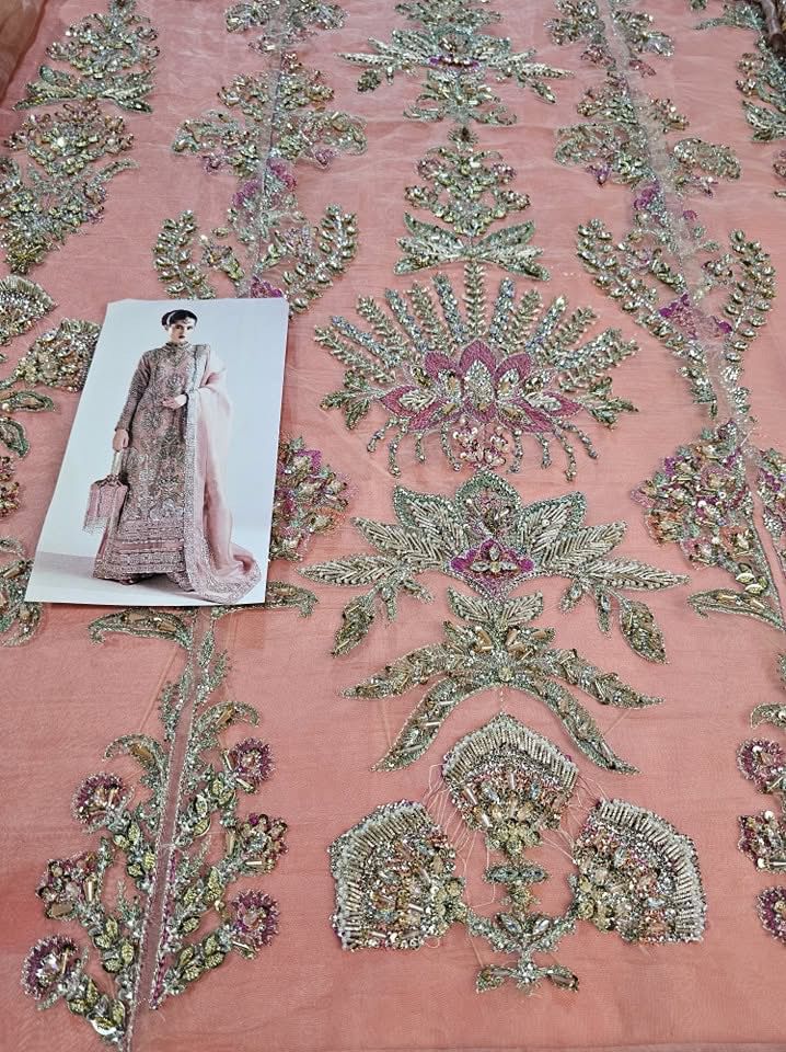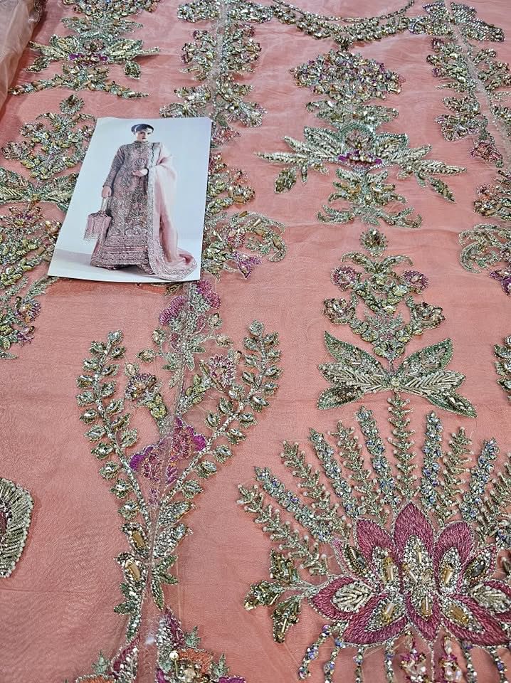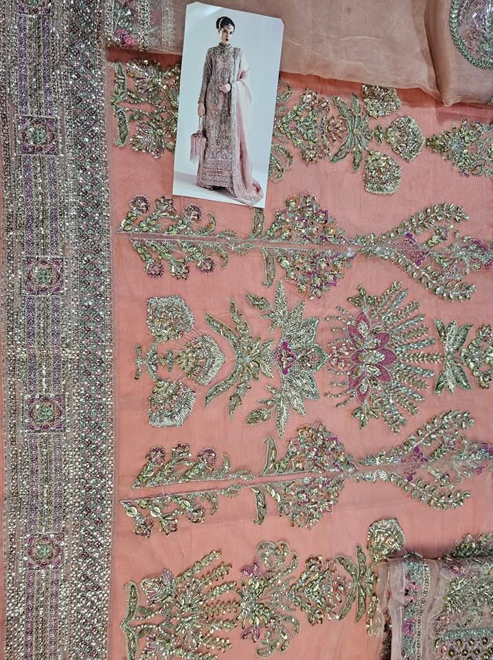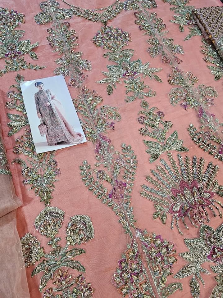 This regal outfit rendered in a beautiful shade of Pink on an organza canvas for shirt and Raw-silk palazzo, with heavy embellished motifs along with intricate details. The timeless look is completed with an organza dupatta along with four side heavy embellished borders with 3 different corner motifs embellished with sequins, cut dana and with nakashi, dabka concluding the look marvelously.