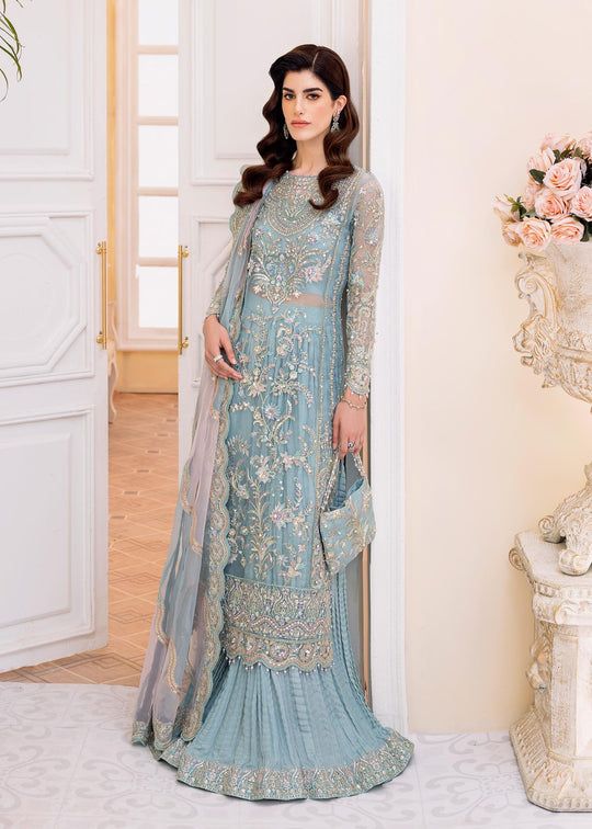 For those who love to wear pastel colours, along with a startle look, Rimel is the perfect design for you. This elegant dress features an organza base, delicately rendered floral motifs with jewel like neckline pattern on a hues of ferozi and pink. It is paired with double toned tranquil laser dupatta and crushed pants.