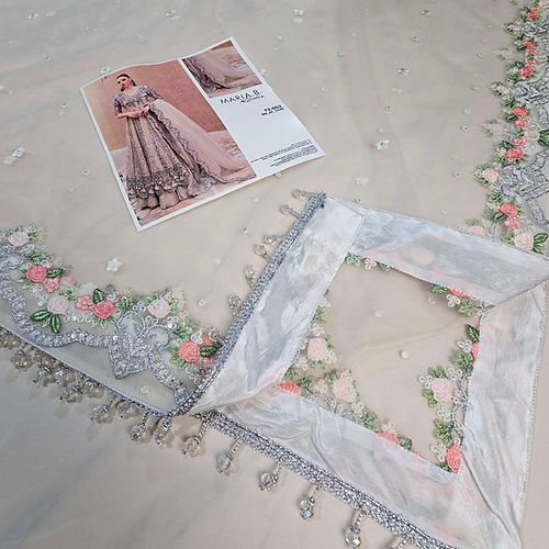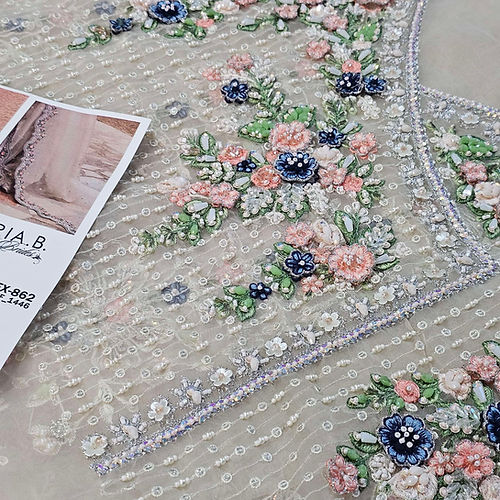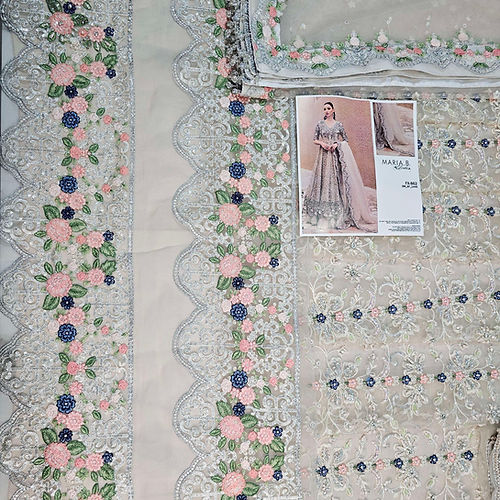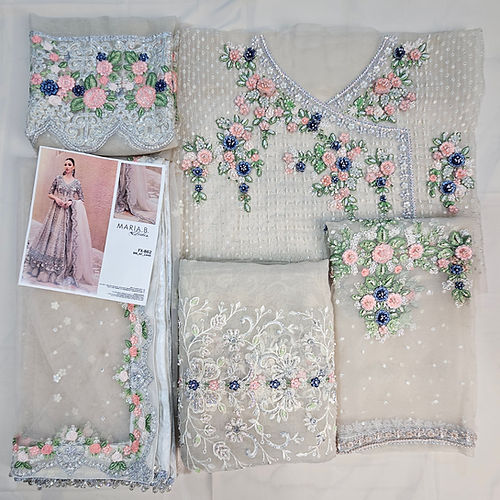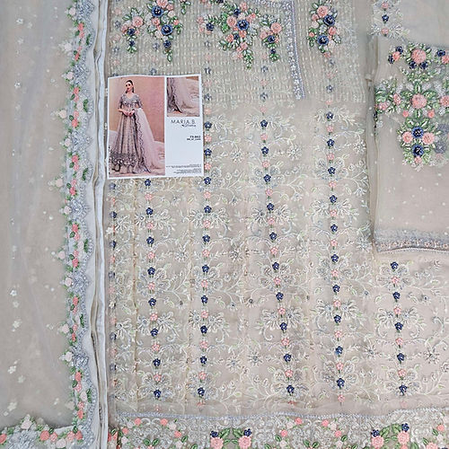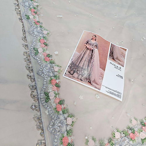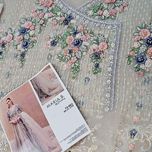 maria b bridal couture Wildflowers of the forest are featured on our Frock Set 'IREM'. This ensemble is an exquisite blend of timeless design and a contemporary silhouette adorned with 3D florals, multi-tone ribbon, sparkling sequins, diamantes, pearls & dabka naqshi so you can look ethereal & dreamy.