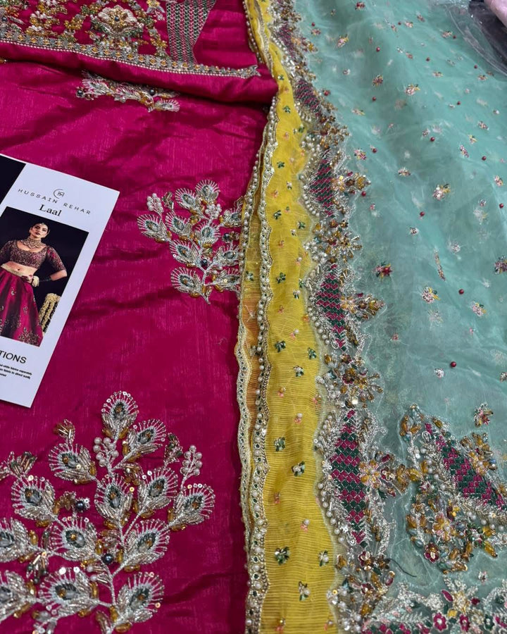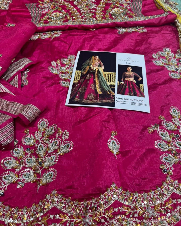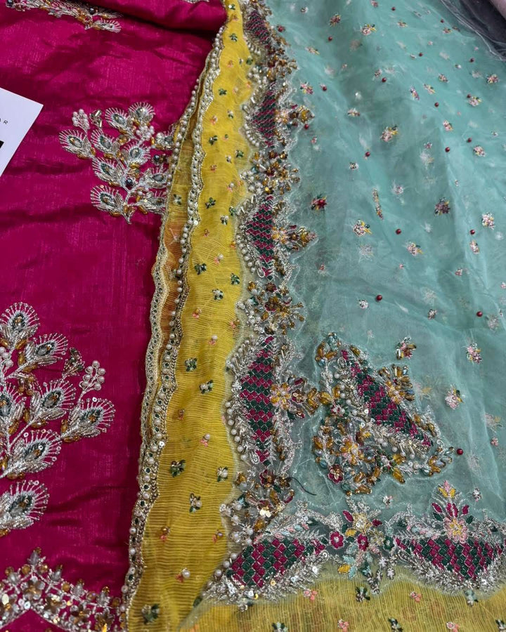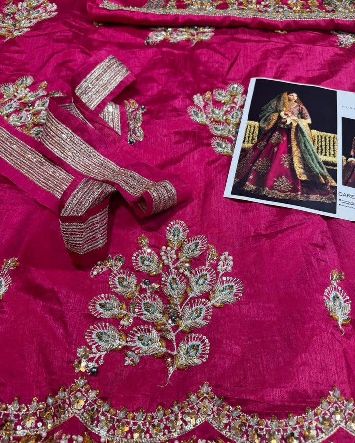 Make a statement with our stunning deep pink pure satin silk lenga, beautifully adorned with hand-embellished bunches and a crisp border. The fully embellished elbow-length blouse adds elegance, while the pure organza dupatta features playful pops of color that elevate the look. Perfect for any celebration, this ensemble seamlessly blends tradition with contemporary flair!