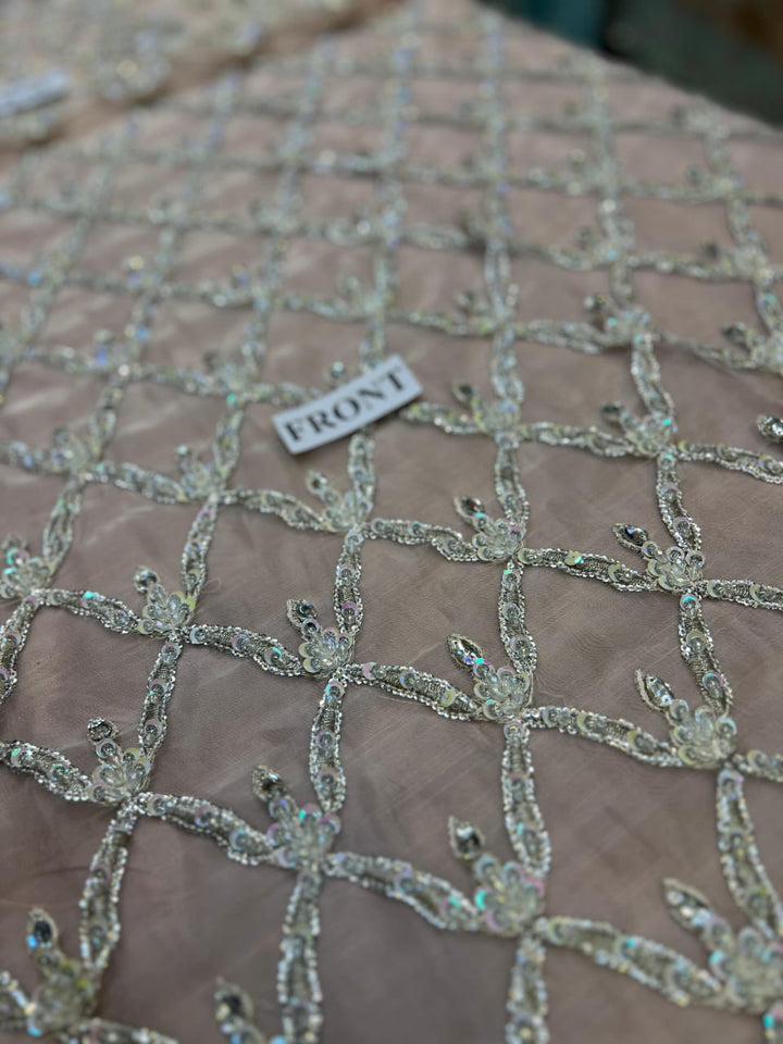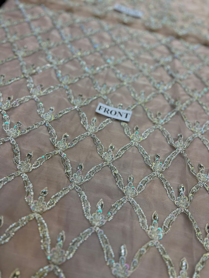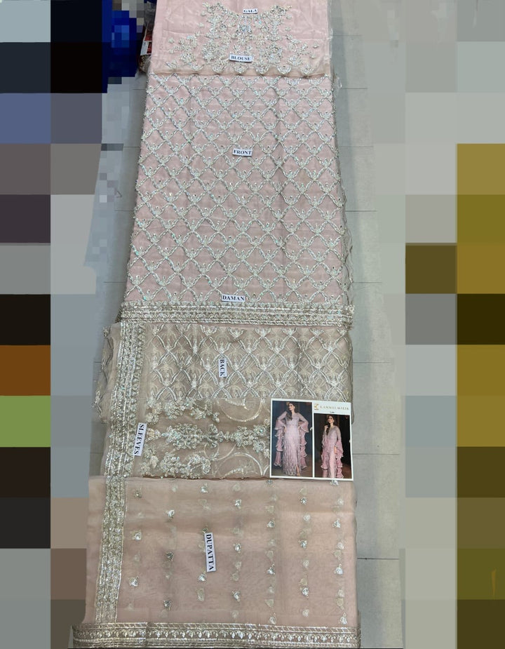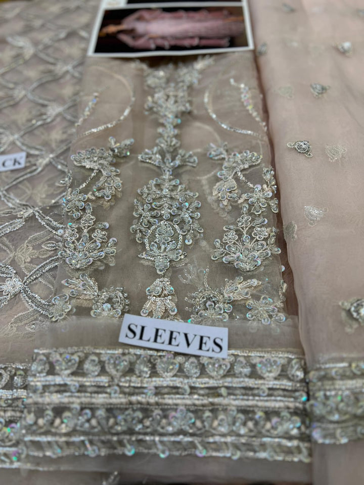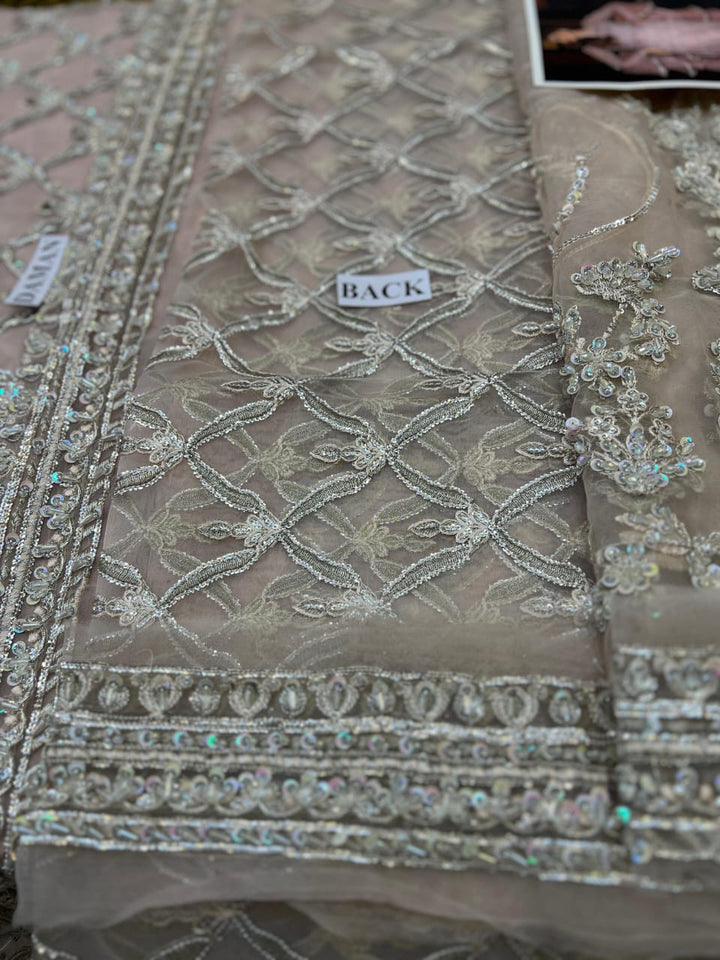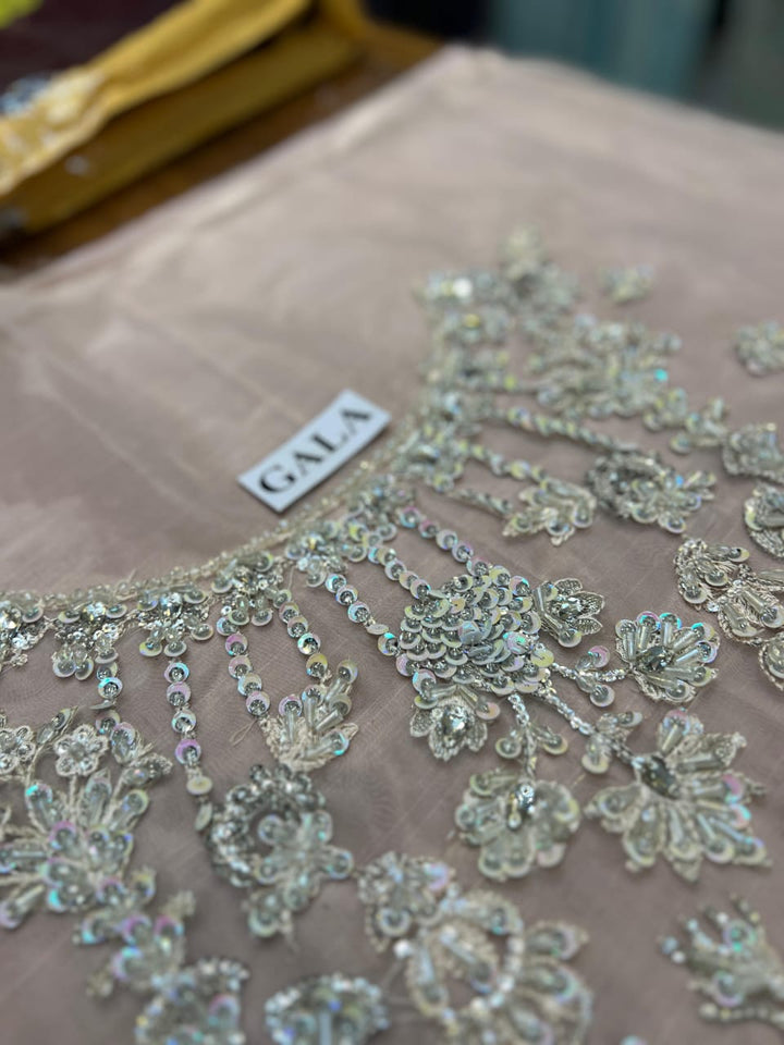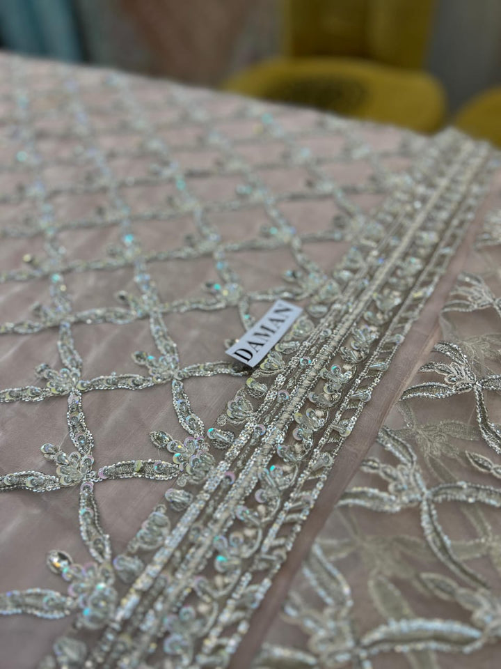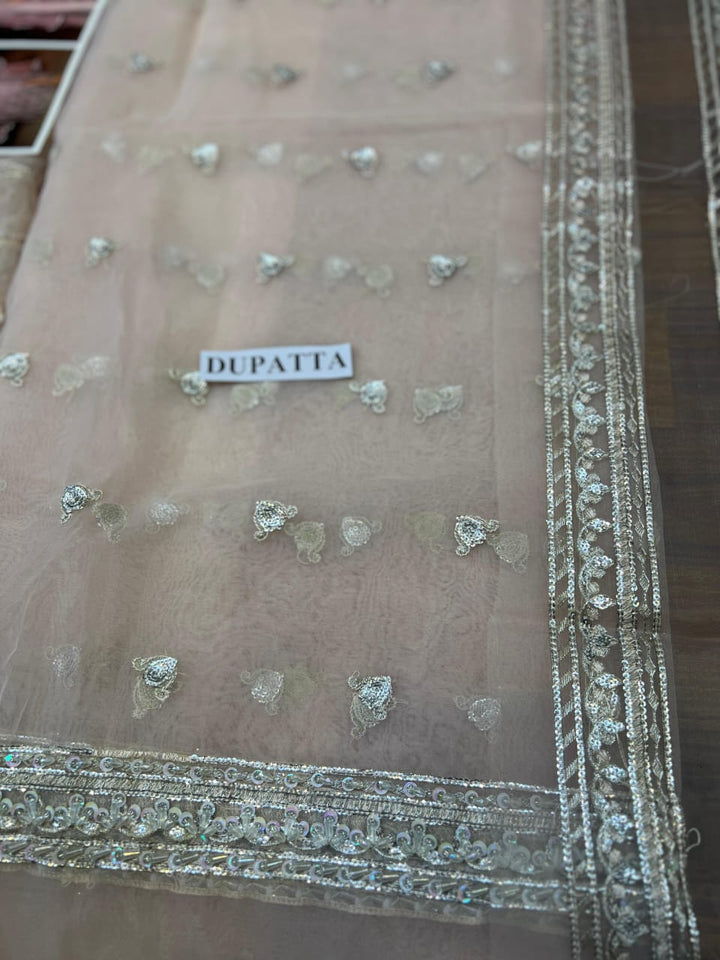 Lara, the ethereal outfit is a lovely day and night formal wear. Lara portrays a long organza shirt, with two front slits, and sparkling crystal ornamentation on a shimmery lilac canvas. This pleasing pattern makes this outfit outstanding while paired with?ruffled dupatta and cigarette pants and pearl details on the hem.