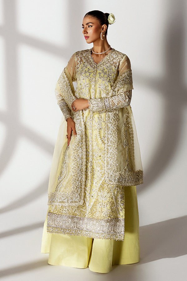 Bask in the glow of elegance with Lemon Sorbet from Scintilla Formal Collection. This powder yellow ensemble with shimmering silver embroidery, striking details, and organza fabric radiates timeless beauty. Paired with raw silk trousers and an embroidered dupatta, it's available in both stitched and unstitched. Grace your festivities with its brilliance!
