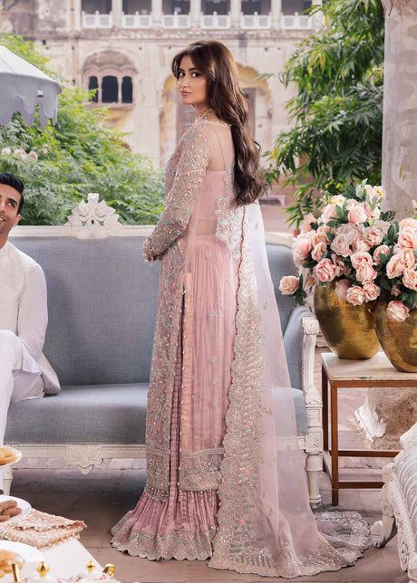 On a flawless light pink canvas, this artfully created piece has embroidered and embellished front. This open front shirt effortlessly captures attention. Elegantly adorned with flowery sequins and handmade accents, along with crushed sharara pants exuding luxury. This embroidered dupatta adds color and festivity, making this grand design one of our favorites in the collection.This outfit exudes grace and sophistication making heads turn. Truly a vision of timeless beauty.