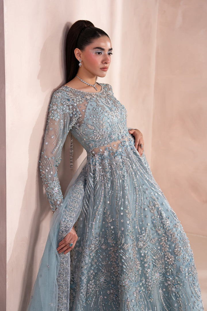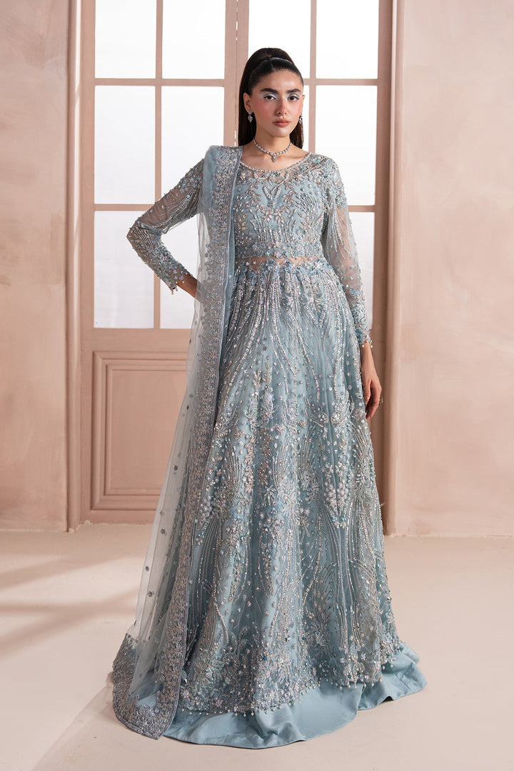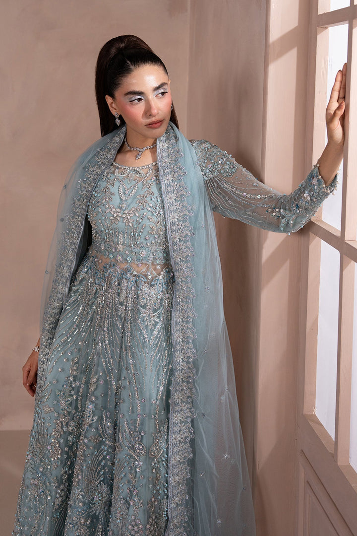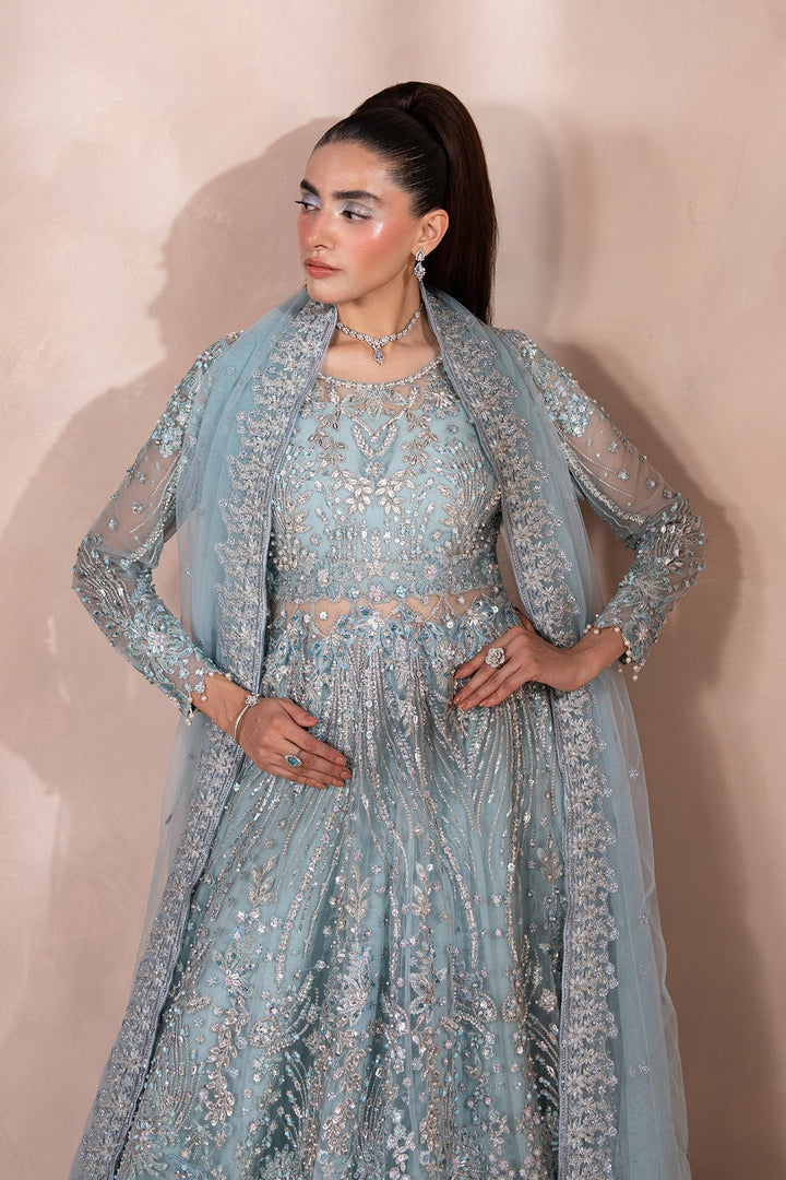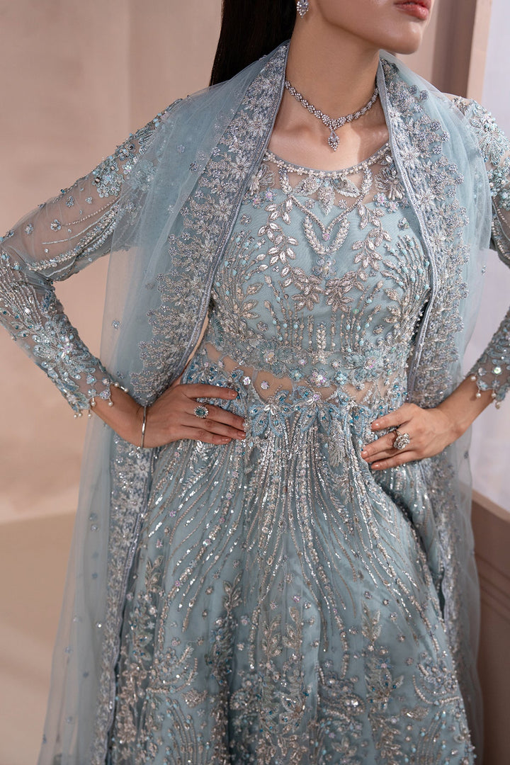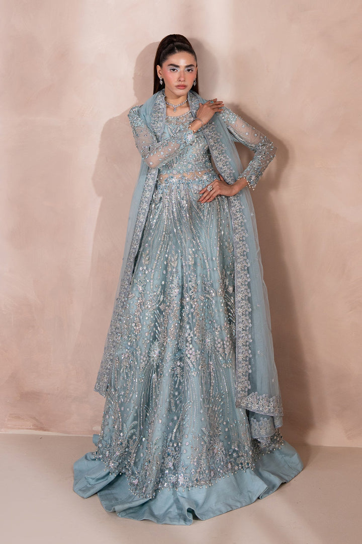- A Mesmerizing Ice Blue Net Pishwas featuring a graceful, floor-length silhouette layered over a long lehenga, creating a soft, regal flow. The entire outfit is adorned with modern, intricate embellishments and contemporary floral patterns, blending elegance with artistic detail. Paired with a matching net dupatta, delicately finished with embellished borders, the ensemble exudes ethereal charm and sophisticationperfect for a refined, fashion forward celebration.