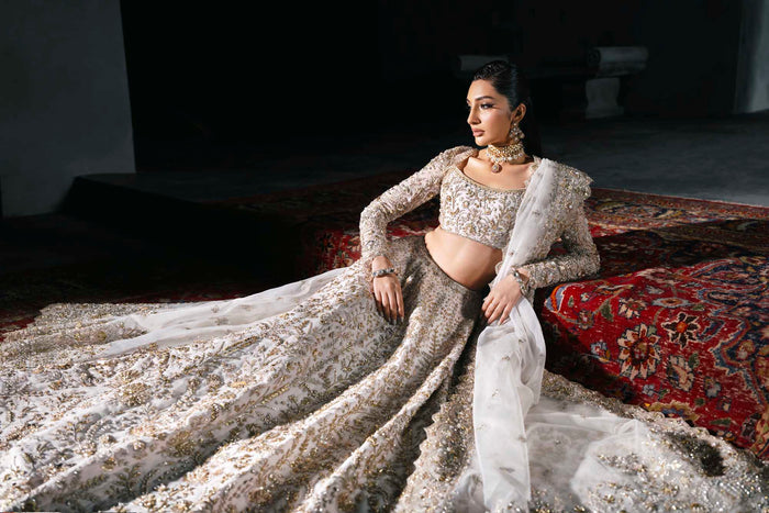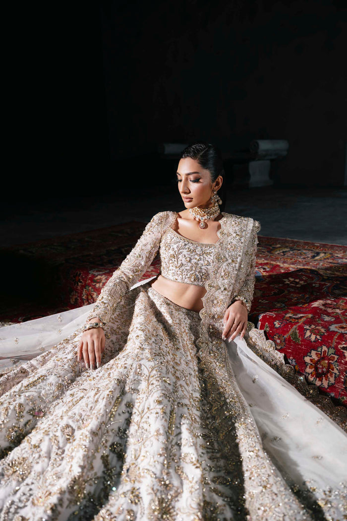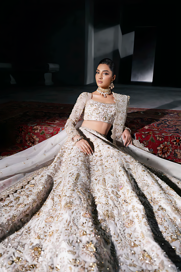 Grace meets grandeur in this ethereal white and gold bridal lehenga by Akbar Aslam. The look features a delicately embroidered choli with full-length sleeves, paired with a voluminous lehenga that blooms with intricate floral motifs in gold threadwork and hand embellishments. The ensemble is balanced with a sheer dupatta edged in finely detailed borders, creating a soft, romantic finish. Light, regal, and effortlessly elegant, this design is perfect for brides seeking a modern yet timeless look for their big day.