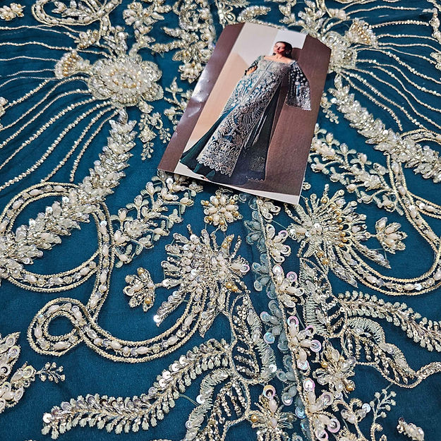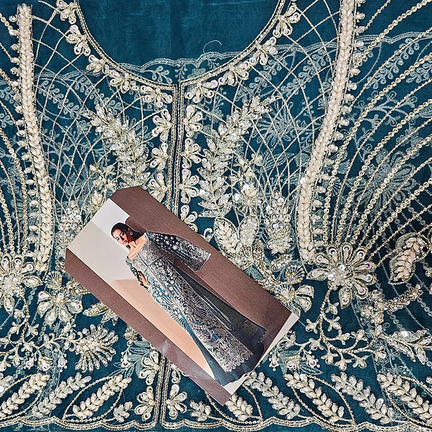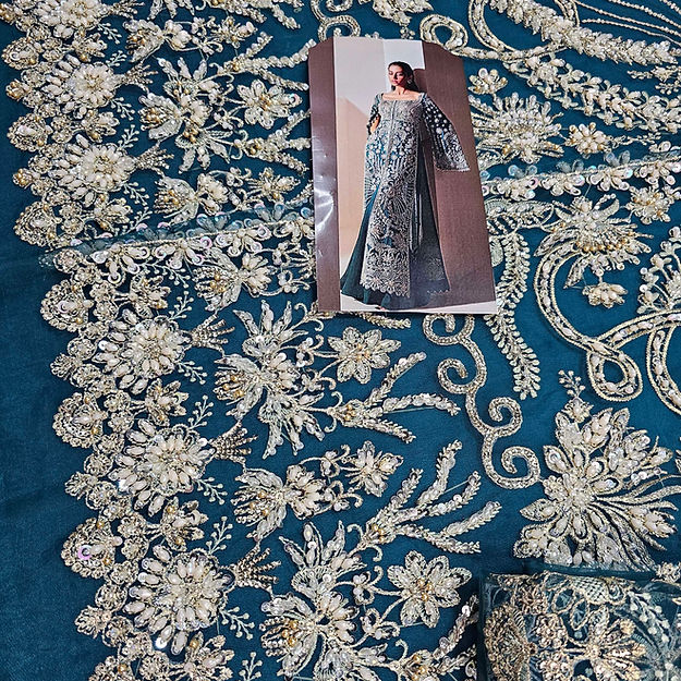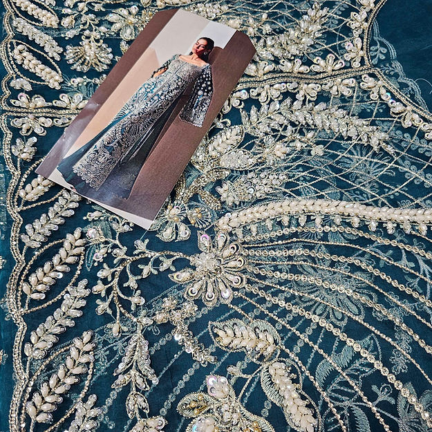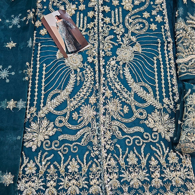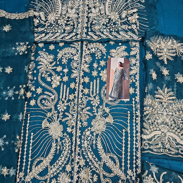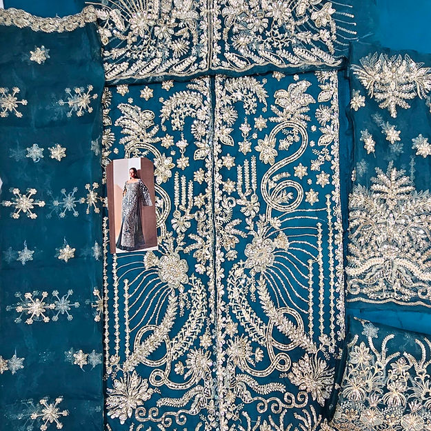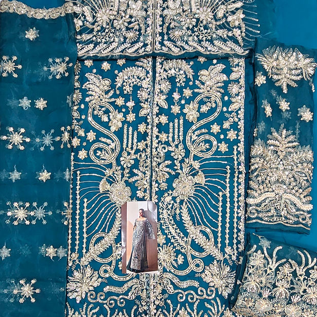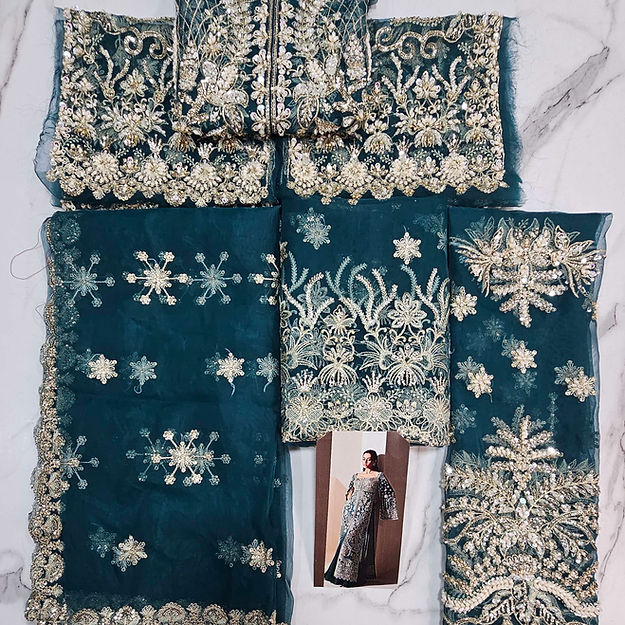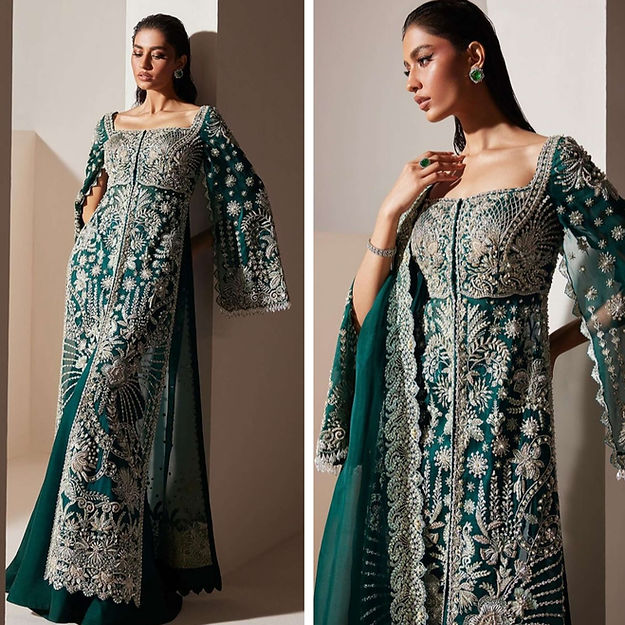 Luxe is a mesmerizing viridescent emerald organza flared gown, adorned with modern, rich silver dhabka, hand beaded details and captivating cape sleeves, elegantly finished with hanging beads paired beautifully with organza duppata heavily embroidered on borders. The ensemble is perfectly complemented by sleek raw silk trousers.