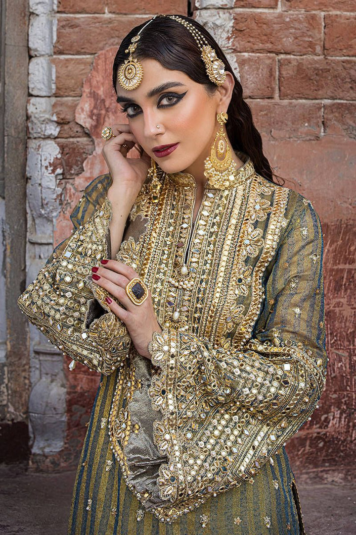 Behold the 'Nawab Sahiba' ensemble, a regal masterpiece for the modern bride. This opulent creation is adorned with Tilla karandi stripes, meticulously embroidered and embellished with twin sequins, mirrorwork, and intricate Tilla work throughout the shirt. The ensemble is elevated by the addition of an organza dupatta featuring sequin strips and a sumptuous four-sided border, perfectly complementing the luxurious aesthetic.The elegance continues with the embroidered trouser, complete with borders of exquisite embellishments. 'Nawab Sahiba' is a testament to timeless grandeur and refined taste, making it the quintessential choice for brides who desire the utmost in sophistication and opulence.