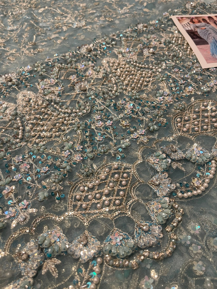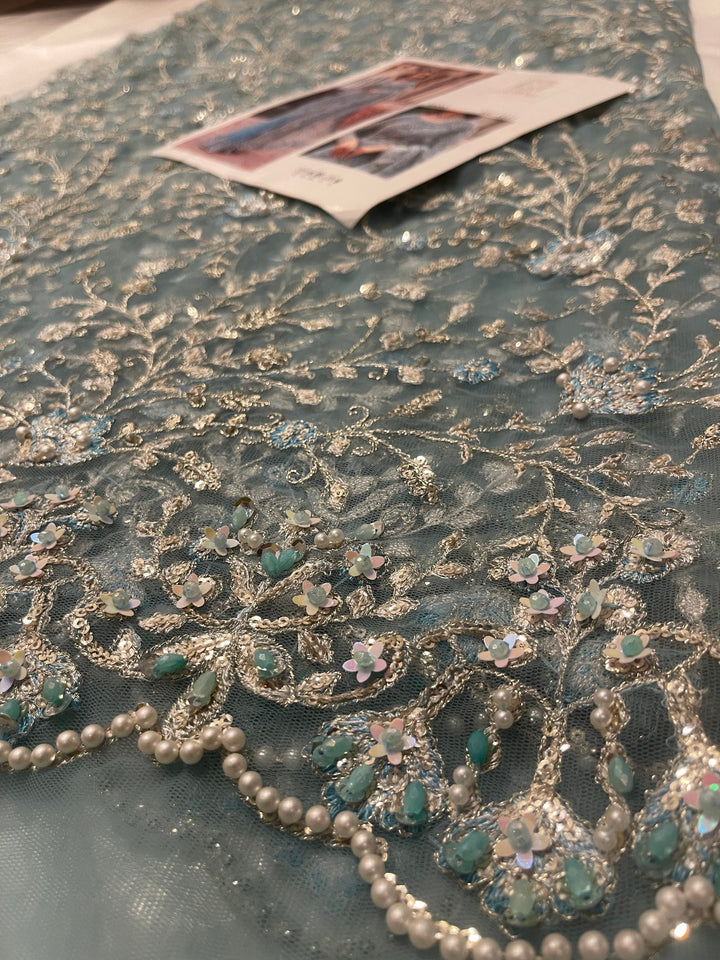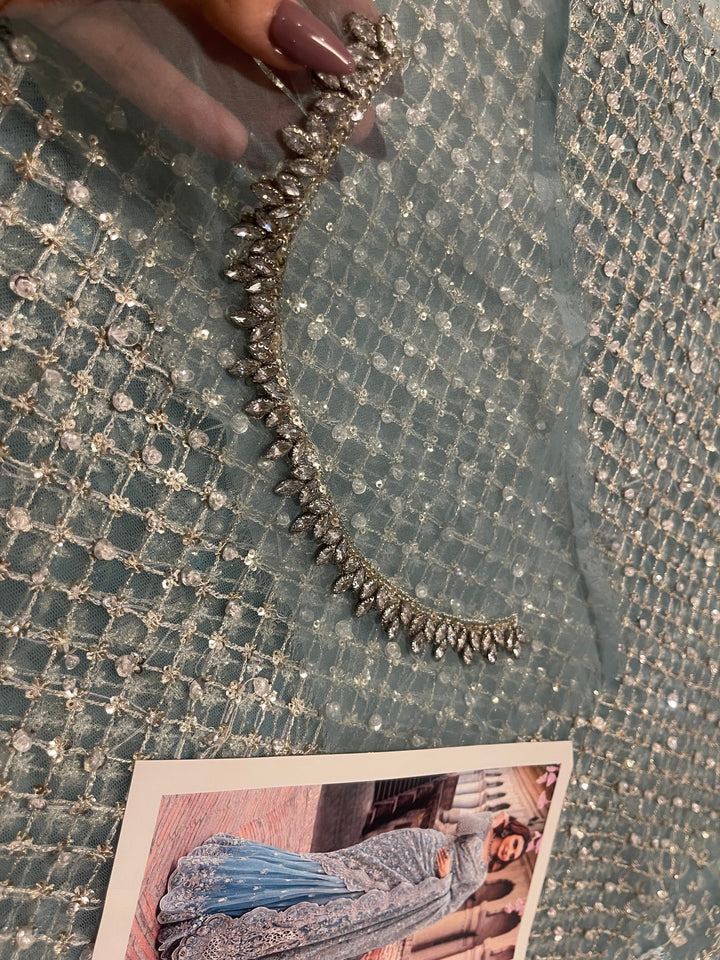 Drenched in the tranquil elegance of pastel ice-blue hues; Mabel’ manifests a vision of timeless beauty with delightful 3D floral work intricately woven with glistening stones, lustrous pearls & sequin accents. This design exudes feminine charm, making it a perfect choice for sophisticated daytime & evening affairs.