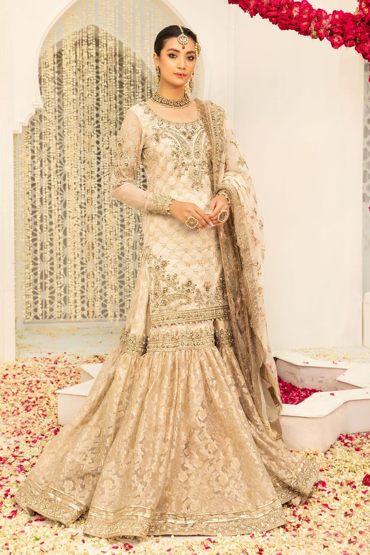 The most loved traditional Kurti Gharara delicately crafted with Kundan Zari hand work and 3D gotta work entwined with sequins, pearls, dabka, naqshi. Dupatta is composed with a floral jaal spread and hand embellished worked head border and three sides light embellished border with suchi kiran finishing all over.