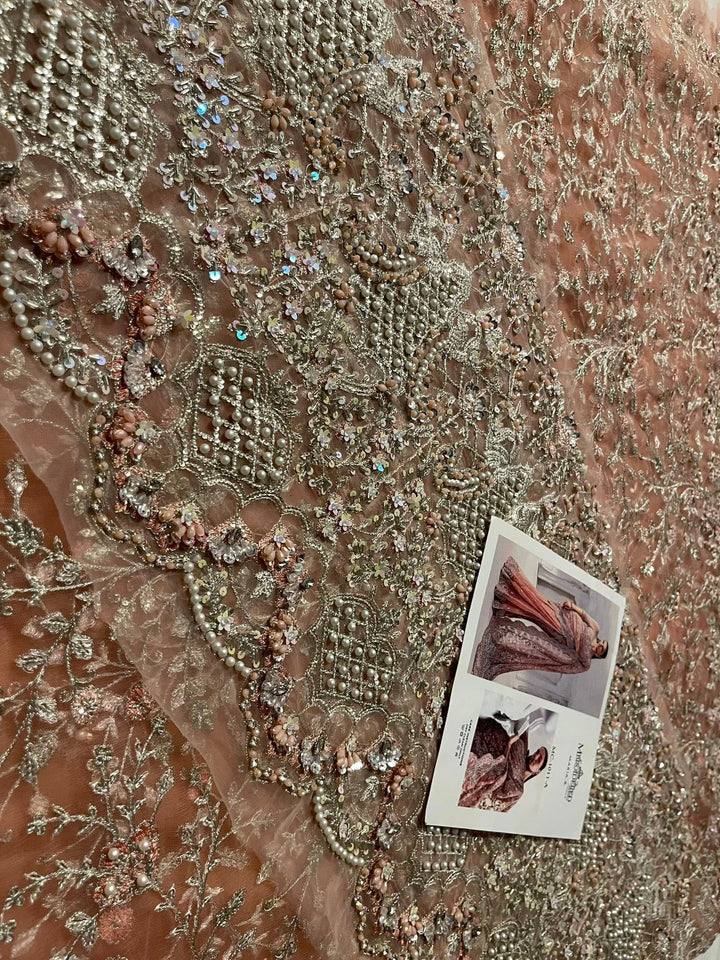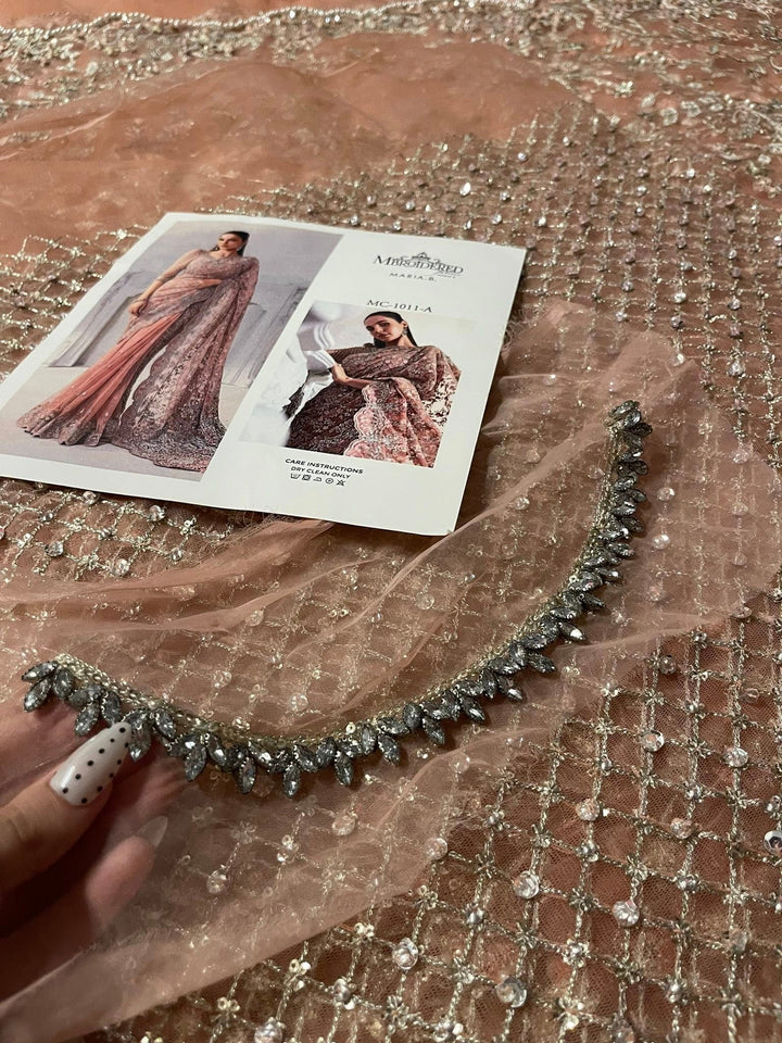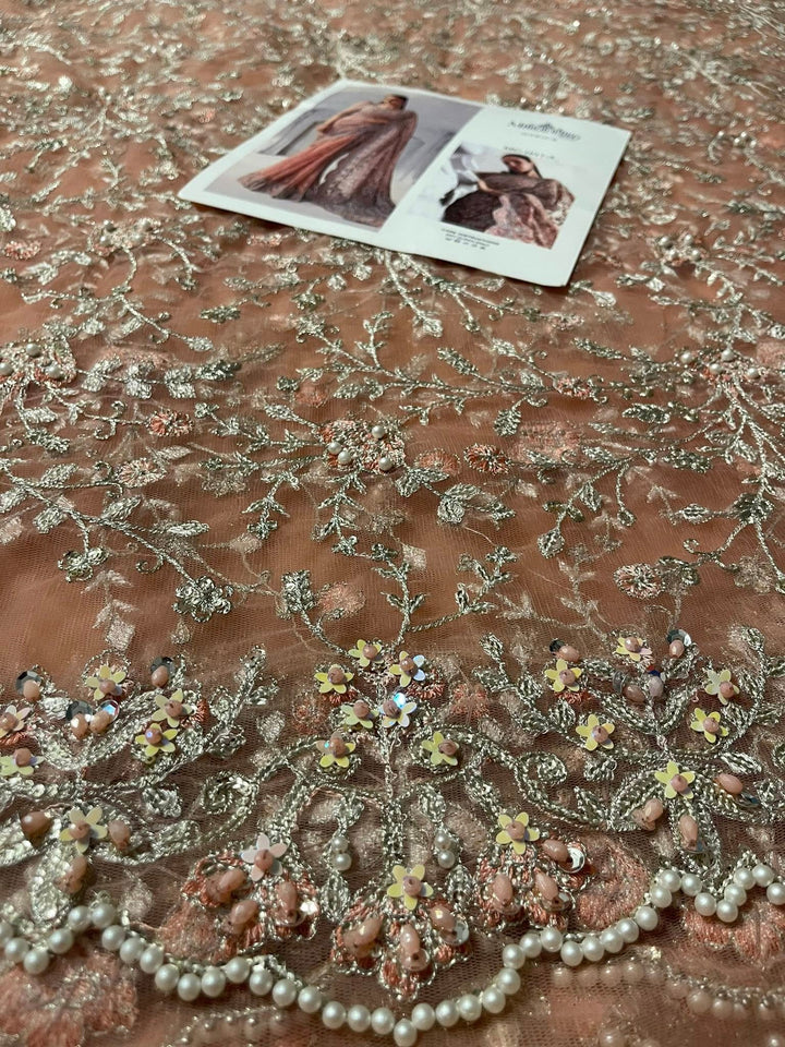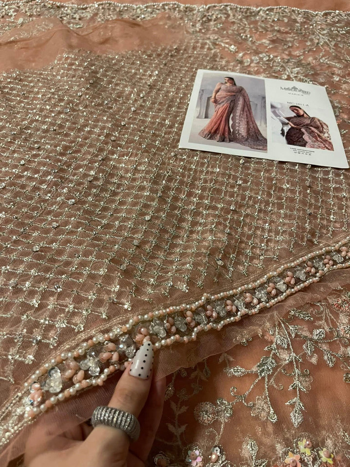 An elegant saree featuring bejewelled neckline and delicate embroideries, pearls, diamonites, sequins and hand cut 3D floral appliques with signature sophisticated cutwork detaling in an ethereal shade of Peach.