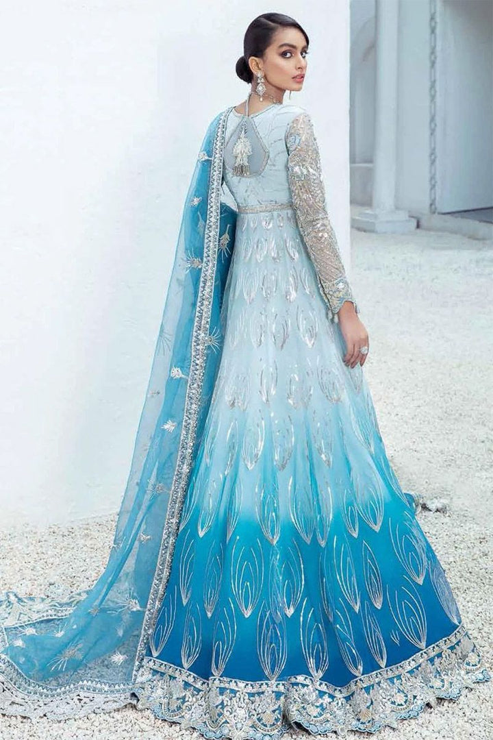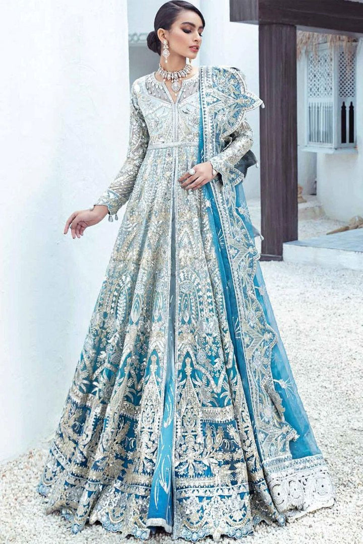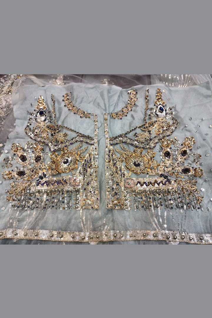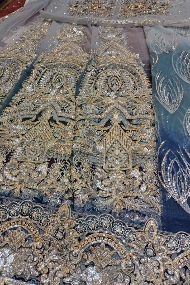 FRONT & BACK = BAREEZE NET BODICE WITH TOTAL ADDA WORK OF HEAVY STONES, PEARLS, SEQUENCE, BEADS, & CRYSTALS WITH FRONT & BACK EMBROIDERY BODICE .SIX WIDE & BEAUTIFUL PANELS WITH 4YARDS FLARE FOR FRONT & BACK WITH ALL FANCY EMBROIDERY OF SEQUENCE, THREAD ,TILLA & RESHAM EMBROIDERY. WIDE & HEAVY EMBROIDERY BORDER FOR FRONT & BACK.