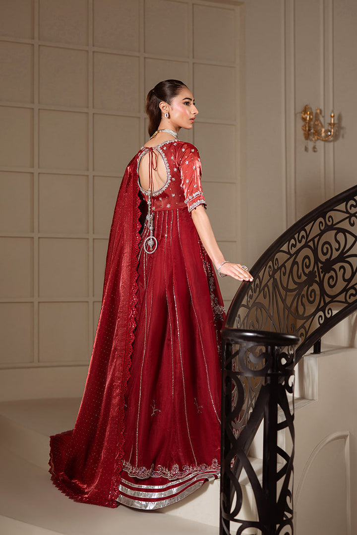 This deep merlot outfit embodies the regal elegance of Empress Mehrunnisa, capturing the significance of maroon in the Mughal royal court—a color reserved for nobility and those of high rank. Crafted from luxurious organza silk, the floor-lenght gown is hand-embellished with intricate zardozi, katdana, and sequins. The long, flowy silhouette is paired with raw silk flared sharara pants, while the dupatta glistens with moonlight stones, adding a touch of sparkle with every movement. A true representation of Mughal opulence and grace, this ensemble honors the Empress’s noble stature and timeless beauty.